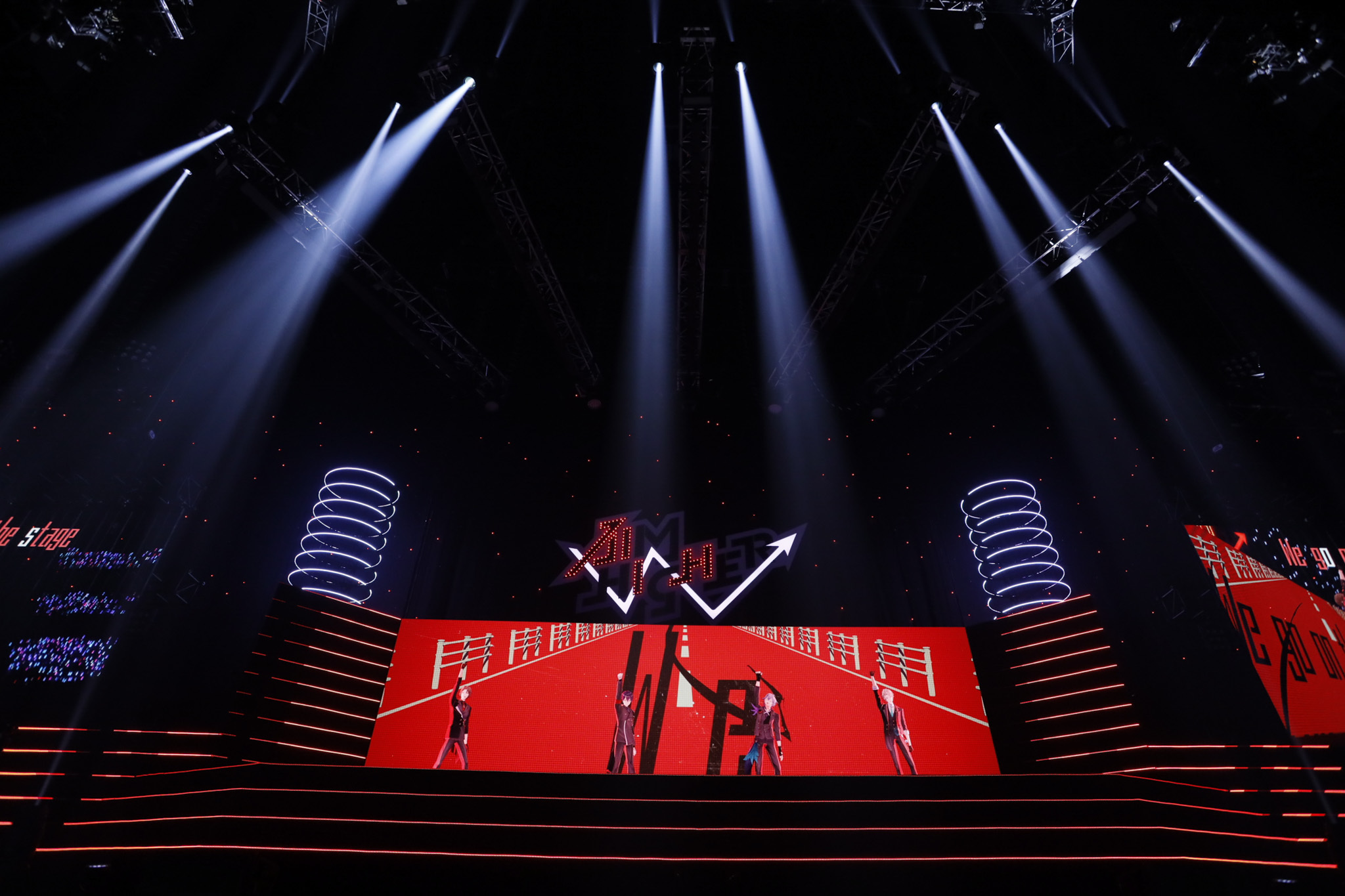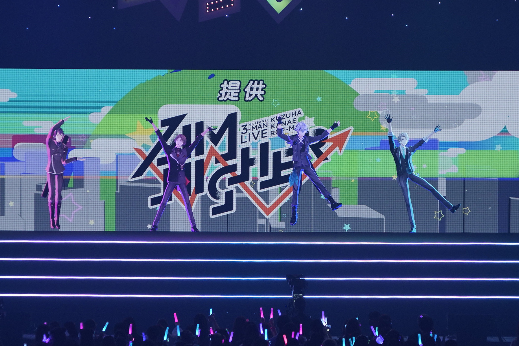 そして5曲目には、カバー曲「きみはマザーファッカー」を披露。スクリーンの映像も原曲を歌うザ・リーサルウェポンズのMVさながら、「新番組」「出演 加賀美ハヤト 剣持刀也不破湊 甲斐田晴」「提供 Aim Higher」などのテロップが並ぶという細かい演出も見られた。