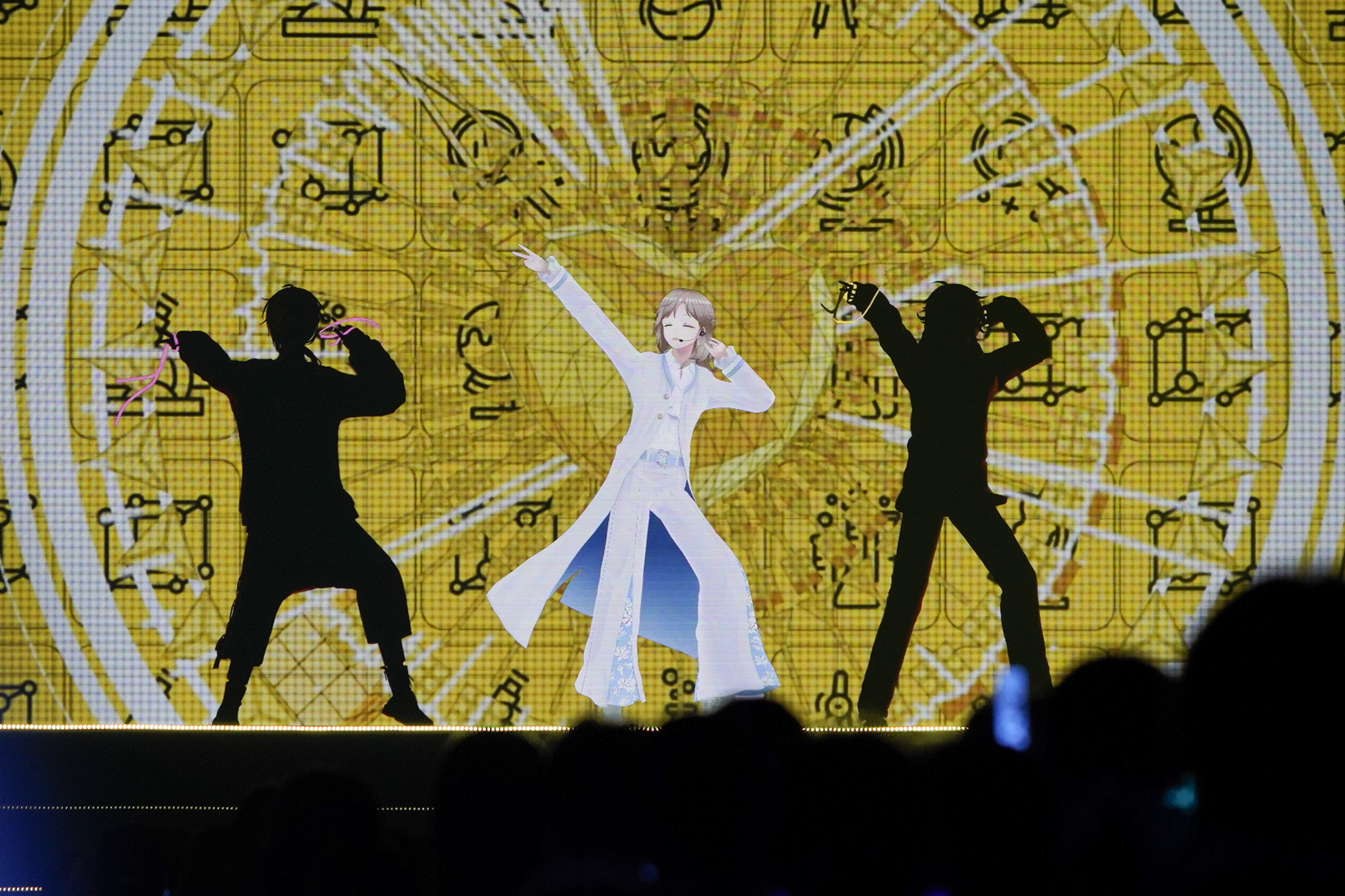 「どうやら儀式が済んだみたいなんで……あの曲に参りましょうか」と加賀美ハヤトが匂わせつつ、続いて披露されたのは「I wanna! You wanna!」。サビでメンバーが揃って大きく手を振るなどの派手な振り付けを見せるが、もちろんそれだけではない。間奏部分で「あれいきますよー!フォーメーションB!」と加賀美ハヤトの掛け声で4人等間隔に並ぶと、「1、2、1、2、3、GO!」の掛け声で一斉にバク転を決める。バーチャルライバーの限界を超えたアクションに、会場の熱はますます上がっていった。