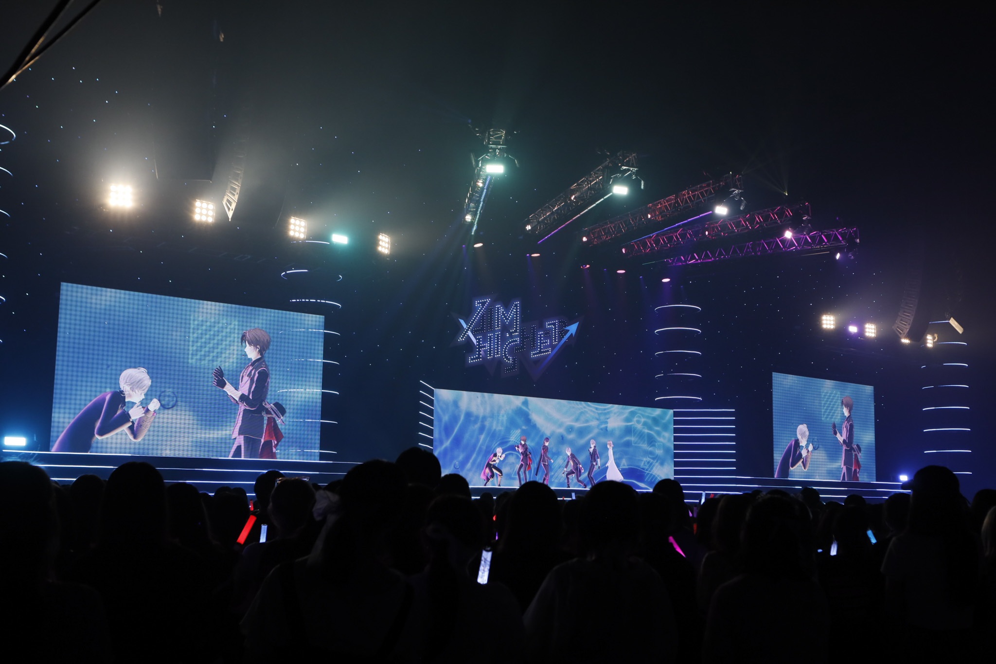 ステージ開始の18時直前、館内アナウンスで「みなさんこんばんはー、叶でーす」「不破ッ、湊でぇーす……」「甲斐田ッ、晴です!」とライバー3人が個性的に挨拶。開演に先立っての諸注意とお知らせを、出演者らが自ら読み上げるというファンサービスを行った。途中で噛みそうになりつつも、アナウンスは終了。最後は「せーの……」と「また後でねー」の声がかぶるというややグダグダな締まりの悪さで笑いを誘い、早くも会場を沸かしていく。