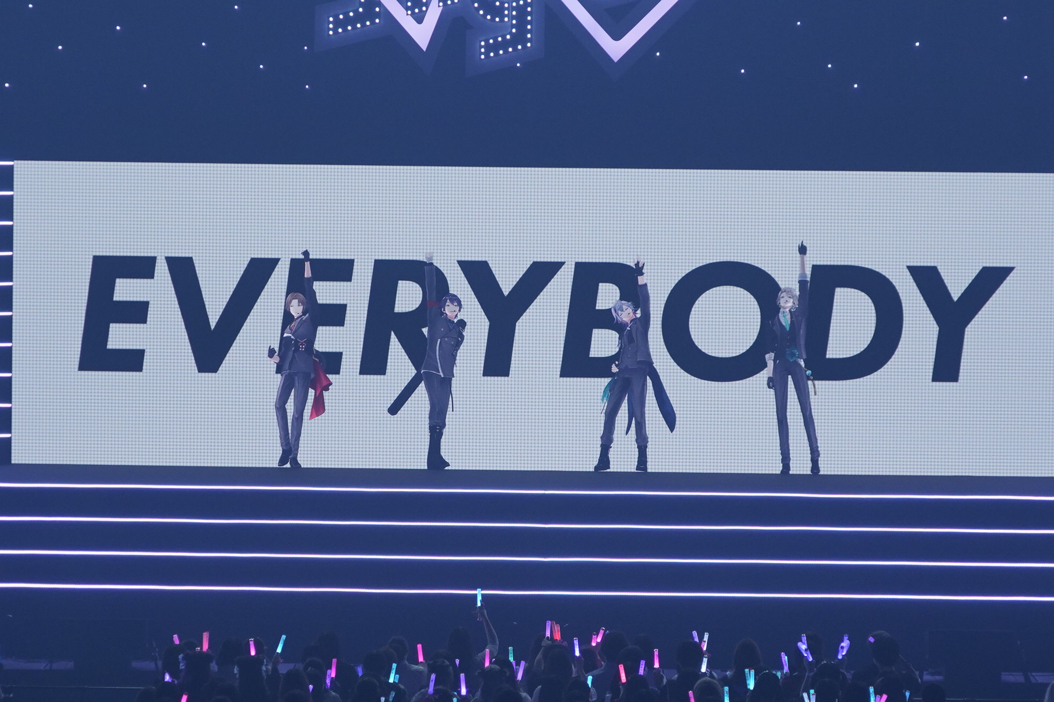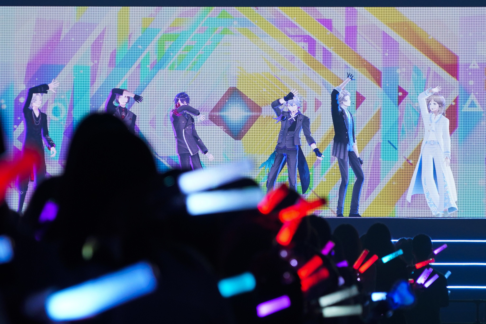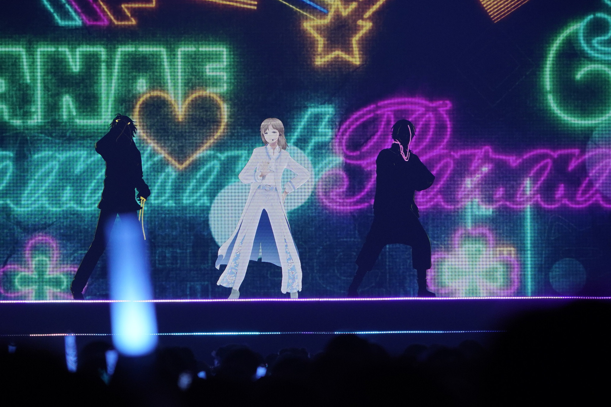 しばらくして、オープニングの映像が画面の中央スクリーンに流れ始める。10から1までのカウントダウンのたびに高鳴っていくジングル。客席のペンライトは思い思いの「推しライバー」のカラーで染まり、照明が落ちた会場を銀河のような美しさで彩っている。
