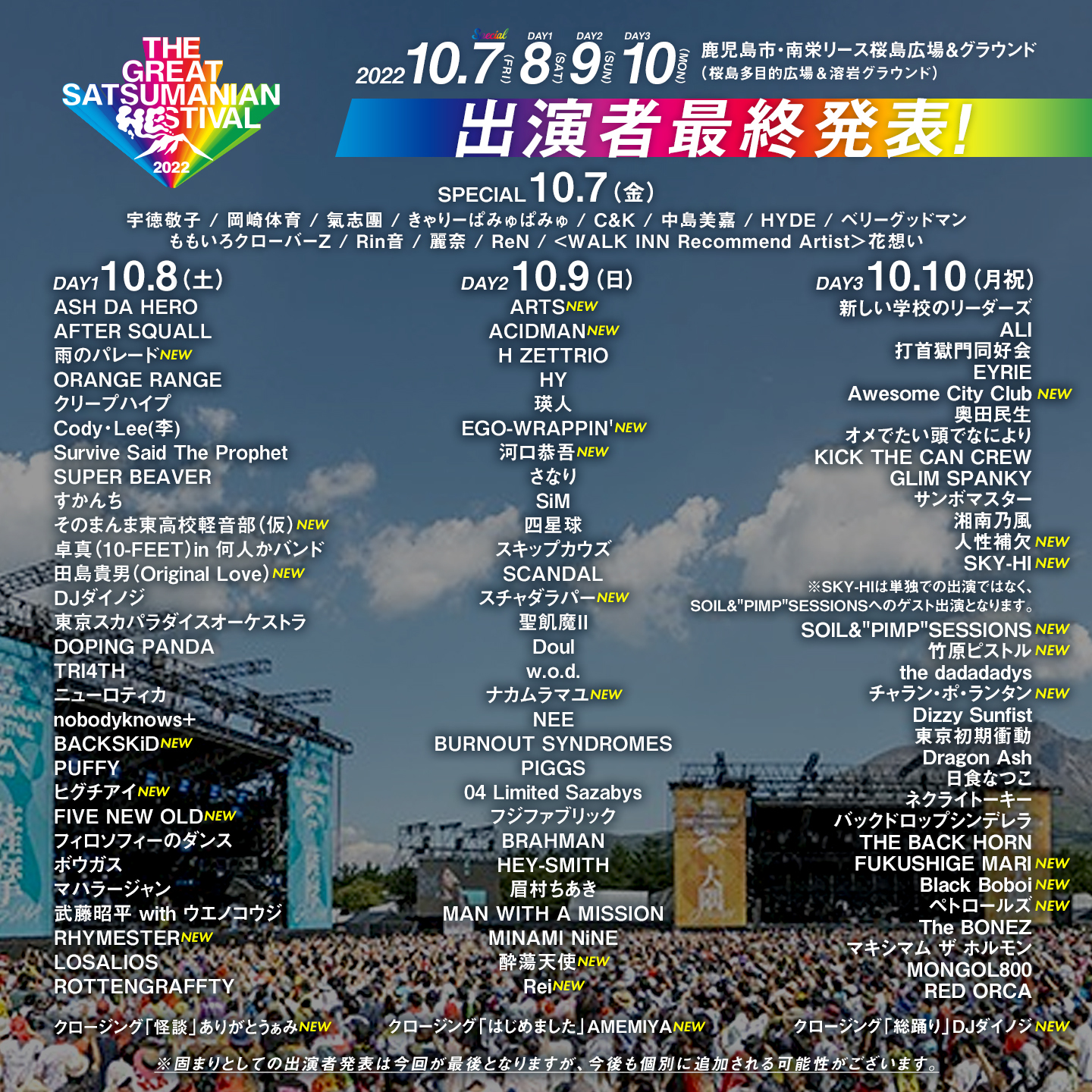 鹿児島・南栄リース桜島広場&グラウンドで10月8日(土)、9日(日)、10日(月)に開催される音楽フェス『THE GREAT SATSUMANIAN HESTIVAL 2022』の最終出演者が発表された。