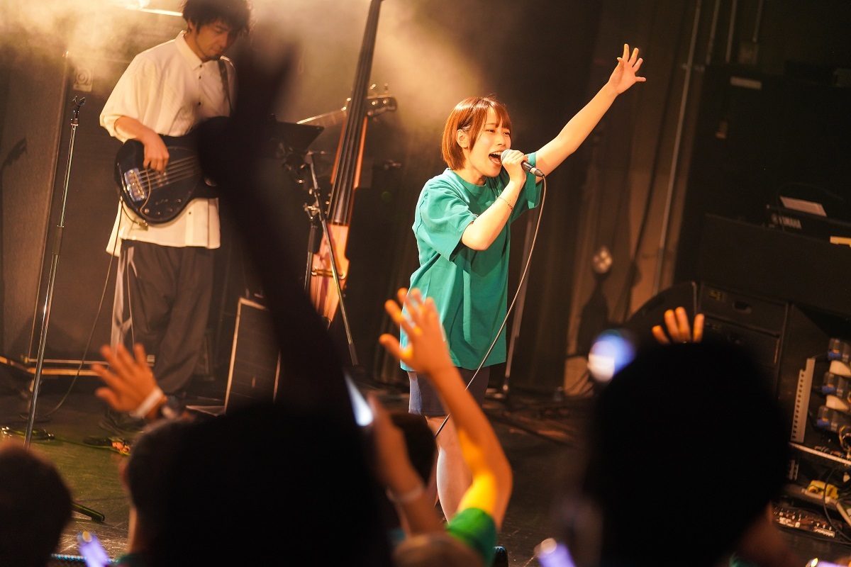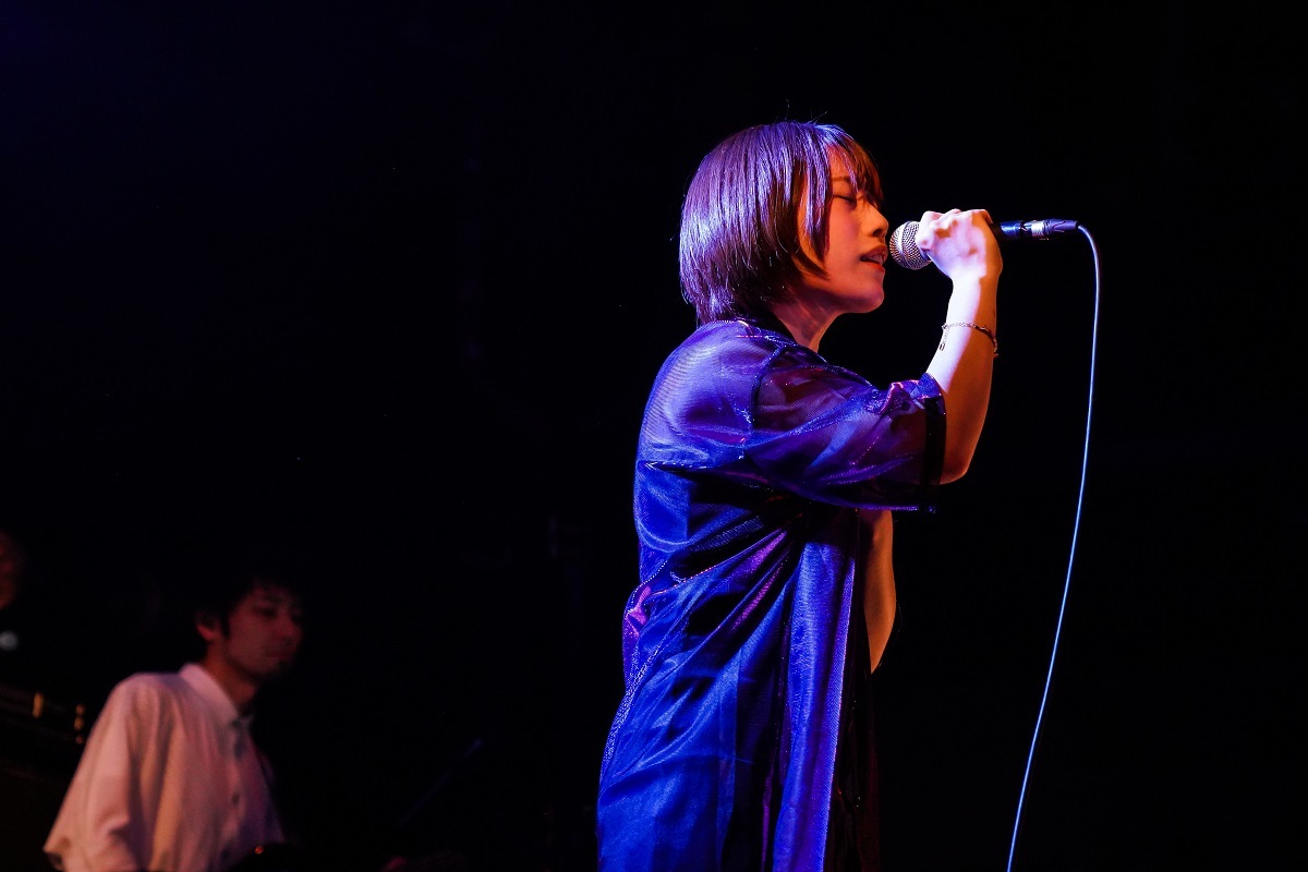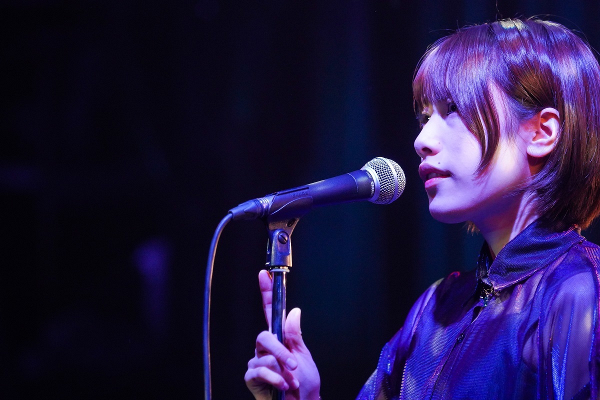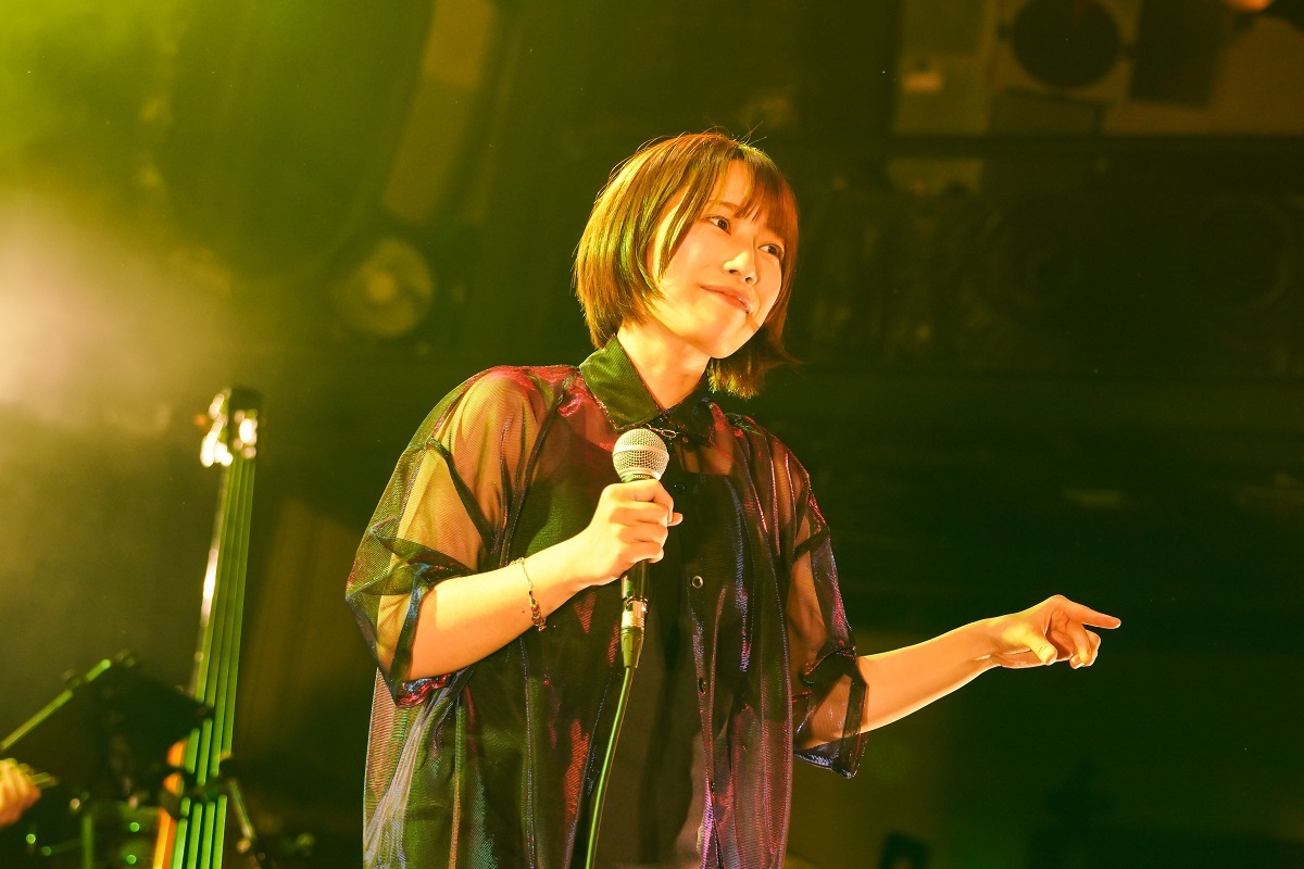 その後、「皆さん、お待たせしました、、!」とMCで語ると、客席のSEECファンは身構えをし始める中で、本公演でフル歌唱が初披露となるゲーム『誰ソ彼ホテル Re:newal』挿入歌の「酩酊Special Var.」を歌唱。作品と共にリニューアルされた楽曲は、よりゴージャスに、繊細ながらも力強く表現されていた。「ここからは私が作詞させていただいた楽曲をお届けします。是非歌詞に注目してお聞きください。」と伝えると、過去の自分のコンプレックスを歌った「Empty Doll」を歌唱。続けて照明の水玉模様が広がる中で「AMAYADORI」を披露。会場全体はまるで“雨宿り”をしているかのような情景を歌で表現していた。雨が上がると、アニメ『デュエル・マスターズ キング』のエンディングテーマの「スタート!」を歌唱。心にまっすぐ刺さる歌詞を一人一人に目を合わせながら届けていた。