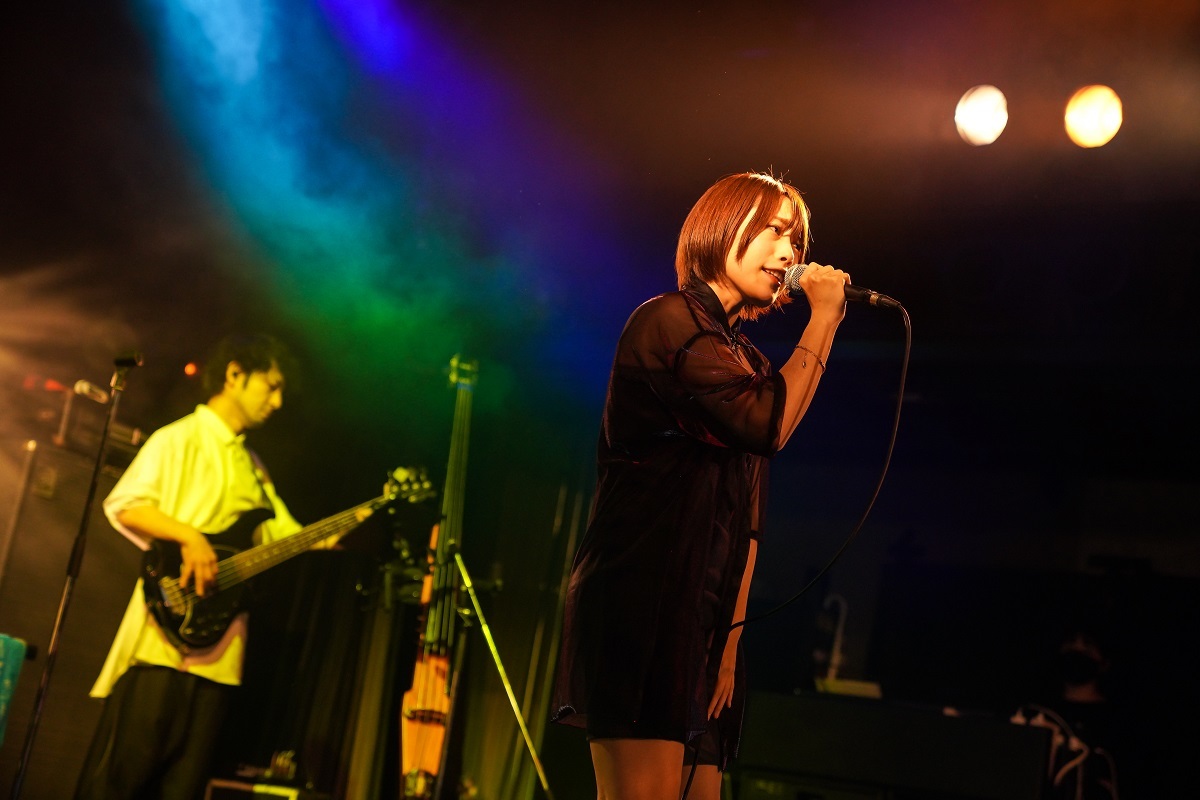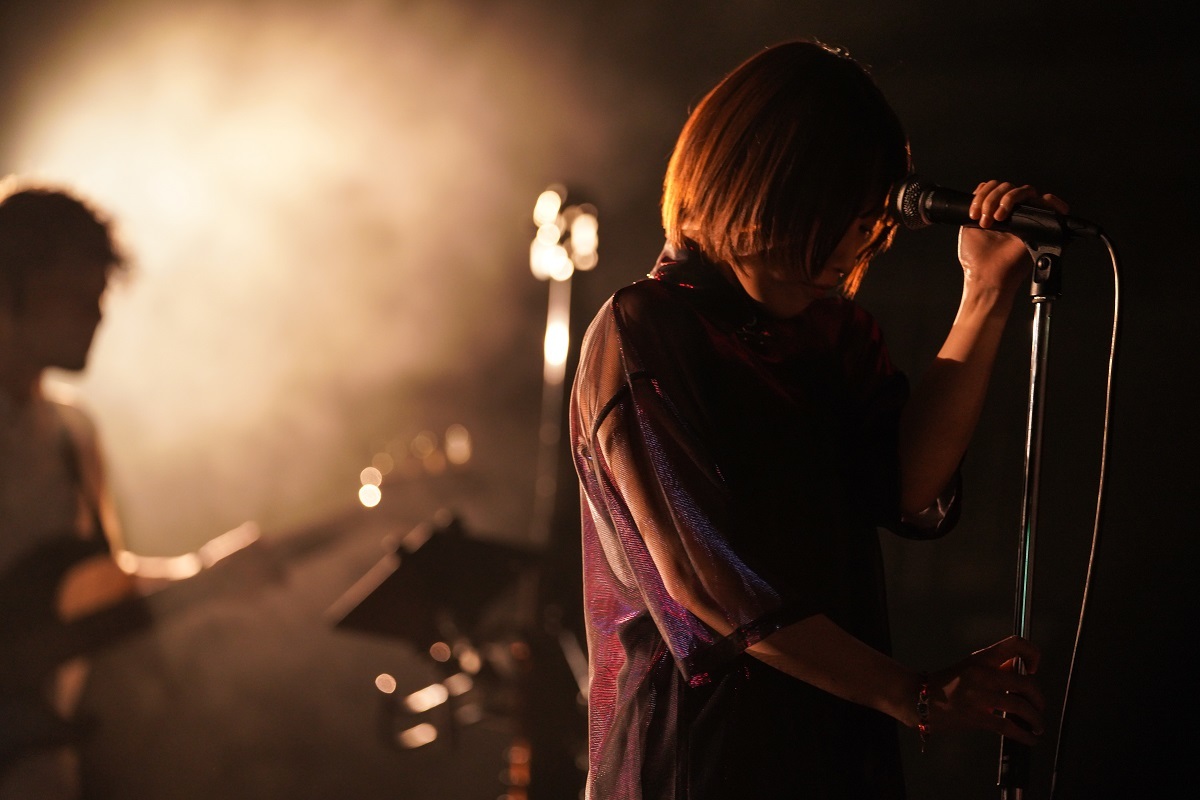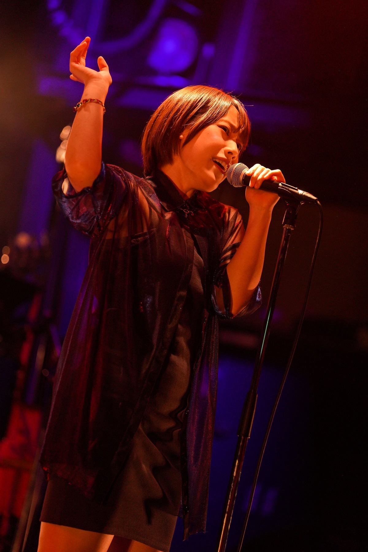 その後、「皆さん、お待たせしました、、!」とMCで語ると、客席のSEECファンは身構えをし始める中で、本公演でフル歌唱が初披露となるゲーム『誰ソ彼ホテル Re:newal』挿入歌の「酩酊Special Var.」を歌唱。作品と共にリニューアルされた楽曲は、よりゴージャスに、繊細ながらも力強く表現されていた。「ここからは私が作詞させていただいた楽曲をお届けします。是非歌詞に注目してお聞きください。」と伝えると、過去の自分のコンプレックスを歌った「Empty Doll」を歌唱。続けて照明の水玉模様が広がる中で「AMAYADORI」を披露。会場全体はまるで“雨宿り”をしているかのような情景を歌で表現していた。雨が上がると、アニメ『デュエル・マスターズ キング』のエンディングテーマの「スタート!」を歌唱。心にまっすぐ刺さる歌詞を一人一人に目を合わせながら届けていた。