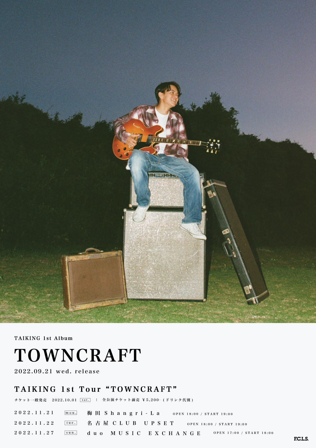 今回のアルバムリリースを記念し、ソロキャリア初となる東京、大阪、名古屋の3都市を巡るTAIKIG 1st TOUR「TOWNCRAFT」の開催も決定。昨年8月の「Easy」でのソロデビューから1年。今回のツアーは全国の皆さんにTAIKINGが直接音楽を届けられる待望のライブツアーとなっている。チケットの予約先行受付は8月11日(木)午前10:00よりTAIKING Official Fan Club「TAIKINGDOM」にてファンクラブ先行が受付スタート。一般先行の受付は8月17日(水)からとなっている。