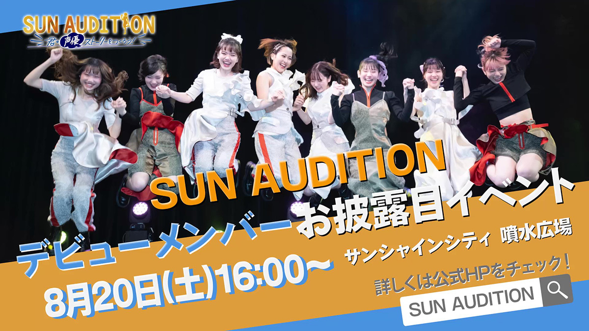 株式会社81プロデュースが実施する、演技・歌・ダンスの3つを兼ね備えた声優ガールズユニットのメンバー発掘オーディション『SUN AUDITION~君のストーリーをつくろう!君が声優アーティストになる物語~』。応募総数3,347名の中から選ばれた、デビューメンバーのお披露目イベントを2022年8月20 日(土)16:00からサンシャインシティ噴水広場にて開催することが発表された。