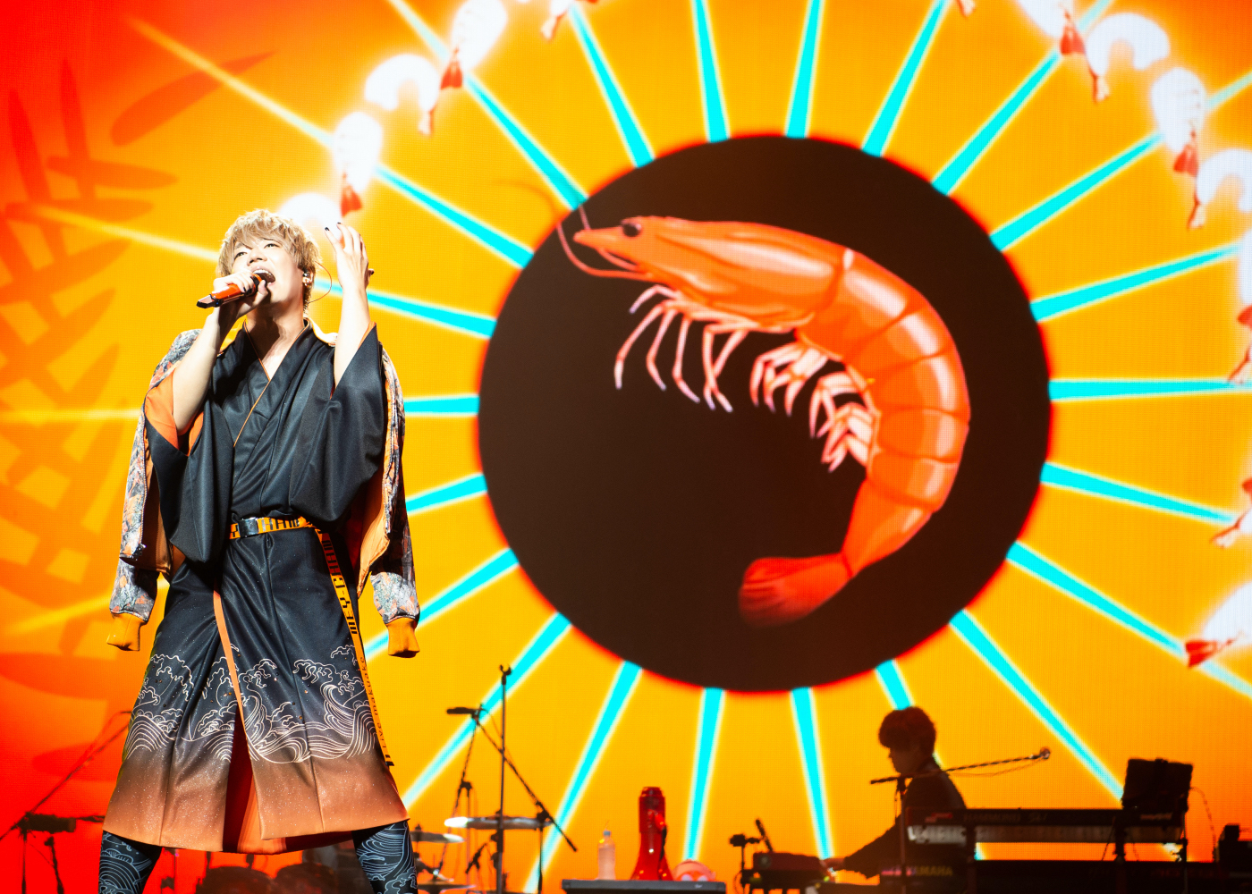 笑顔を見せ、「ここでバラードを聴いてください」と艶っぽいフェイクで導いたのは……なんと「トスリーマの祟り」。民族音楽的なリズムの上で<このイノティ・カラーダ><カッスィーの意味なんてそんなのティキトゥさ>とたたみかけ、<そんなことよりエビをくわせろ>とエビ愛を炸裂させて、それだけではすまずに混沌へといざない、クールなラップまでねじ込んでしまうナンバーだ。ジャングルの中にそびえるマヤの階段ピラミッド、踊るエビ。映像も謎すぎる。ゴーゴーダンスで歌いながら、「いいのか俺ここに立って」と思わず笑ってしまうめいちゃん。その姿に、こちらも笑いを禁じ得ない。