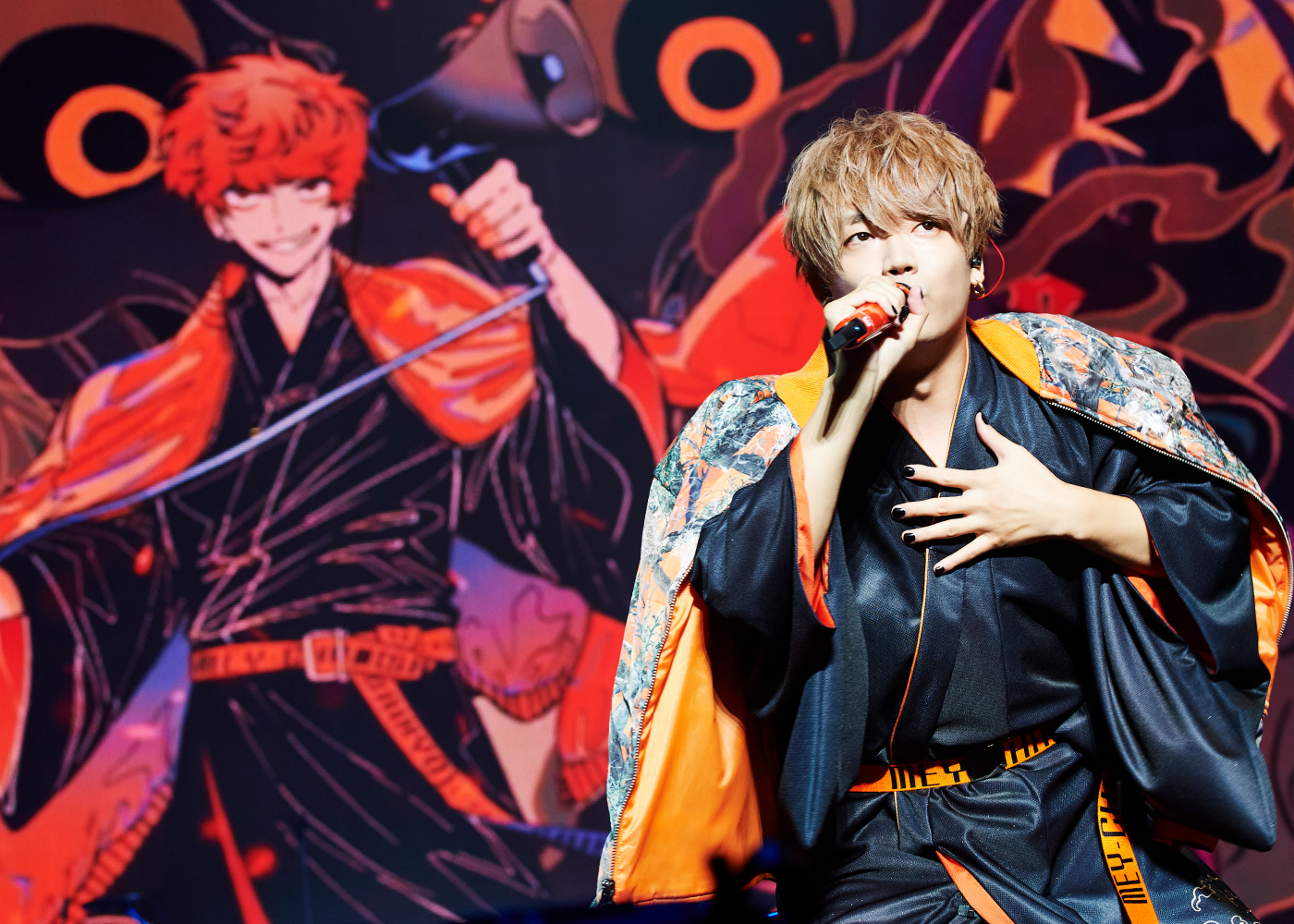 めいちゃんは“嵐を呼ぶ男”でもあるのか、台風8号が関東に接近しつつある中。賑やかな祭囃子が鳴り始めてドキドキが止まらないめいふぁみ(めいちゃんファンの呼称)の耳を一瞬で虜にしたのは、『Humor』の1曲目である「ラナ」の歌い出しだ。ステージを覆っていた赤い幕が左右にゆっくり割れると、ピアノ伴奏のみで美声を響かせるめいちゃんの姿が。この単独公演のキービジュアルそのままのいなせな和装といい、めいちゃんをぐるりと囲む円形の透過スクリーンに映し出される浮世絵風のイラストといい、『幕明け』の幕開け、だいぶインパクトがある。疾走感あふれるバンドサウンドが重なって透過スクリーンが上昇すると、ステージ中央の張り出し舞台へと駆けるめいちゃん。生で聴く「会いたかったよ!」という言葉、<僕ら最強だ>というフレーズにも胸が高鳴る。