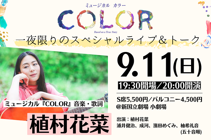 ミュージカル『COLOR』の作曲を手掛ける、シンガーソングライターの植村花菜自身による弾き語りライブ。楽曲の制作秘話なども聞きながら楽しめる特別な時間となる。
