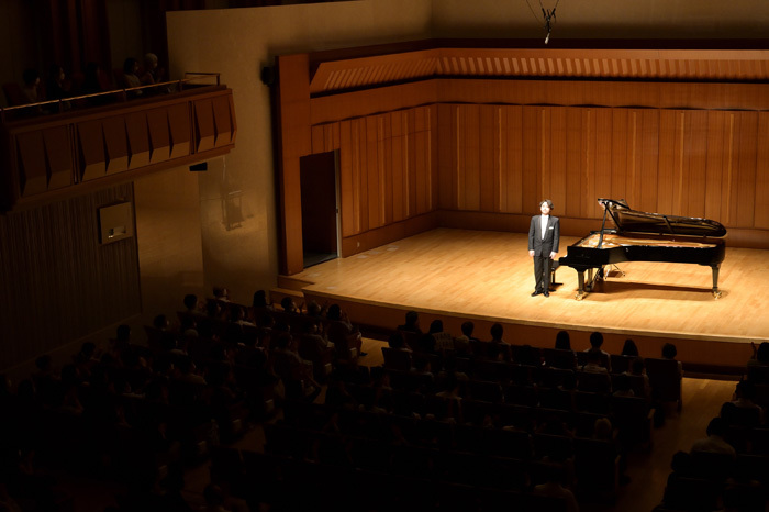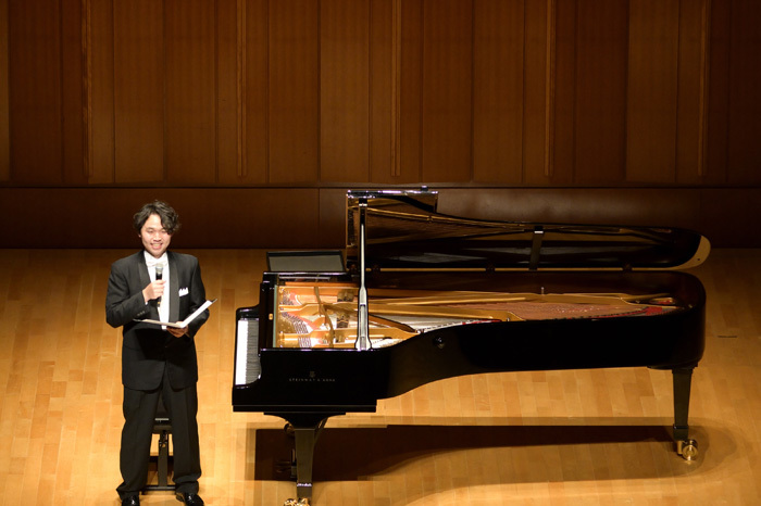 14時の開演とともに、ピアニストの髙木竜馬が颯爽とステージに登場。これから休憩をはさんで約二時間にわたるピアノとトークによる一人舞台が繰り広げられる。プログラム前半は、冒頭で演奏されたベートーヴェン「エリーゼのために」を除いては、すべてショパンの舞踊作品というラインナップ。一曲目の 「エリーゼのために」では、髙木は品格あふれる粛然たる演奏ぶりで聴衆を『ピアノの森』というコンセプトにふさわしい、深い瞑想的世界へと誘う。