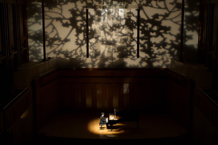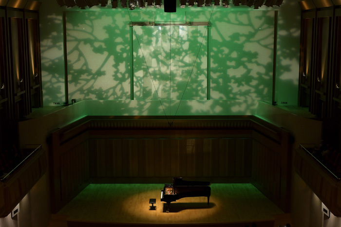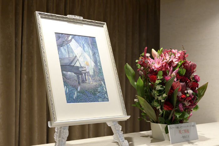 連日の猛暑もものともせず、会場には熱心な『ピアノの森』ファンをはじめ、夏休みを楽しむ子どもたちから、お孫さんたちを連れて来場するおじいちゃん、おばあちゃんまで幅広い年代の聴衆たちが集っていた。平日の昼にもかかわらず会場は満員御礼。この日のチケットは早くから完売したという。会場入り口には今年もこのツアーのために原作者の一色まこと氏自らが手掛けたスペシャルな原画が飾られ、開演前から会場全体が熱気を帯びていた。ピアノが置かれたステージには森の情景をイメージした涼しげで幻想的な背景が映し出されており、会場に集った聴衆を『ピアノの森』の世界観へと誘い込む。(編集註:照明演出は浜離宮朝日ホール限定の特別バージョンのため、他会場での演出はなし。9月18日(日)同会場での公演では実施される)