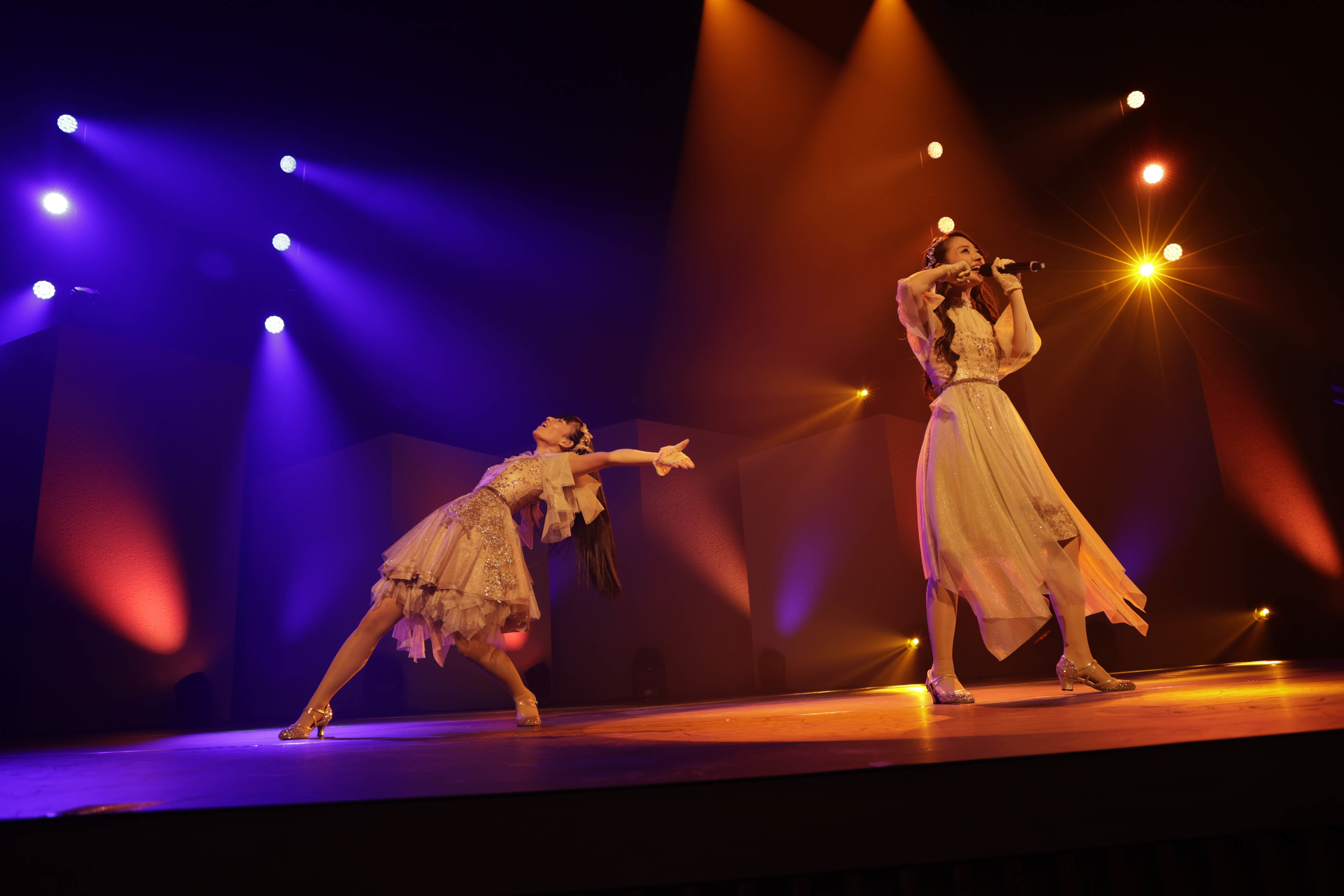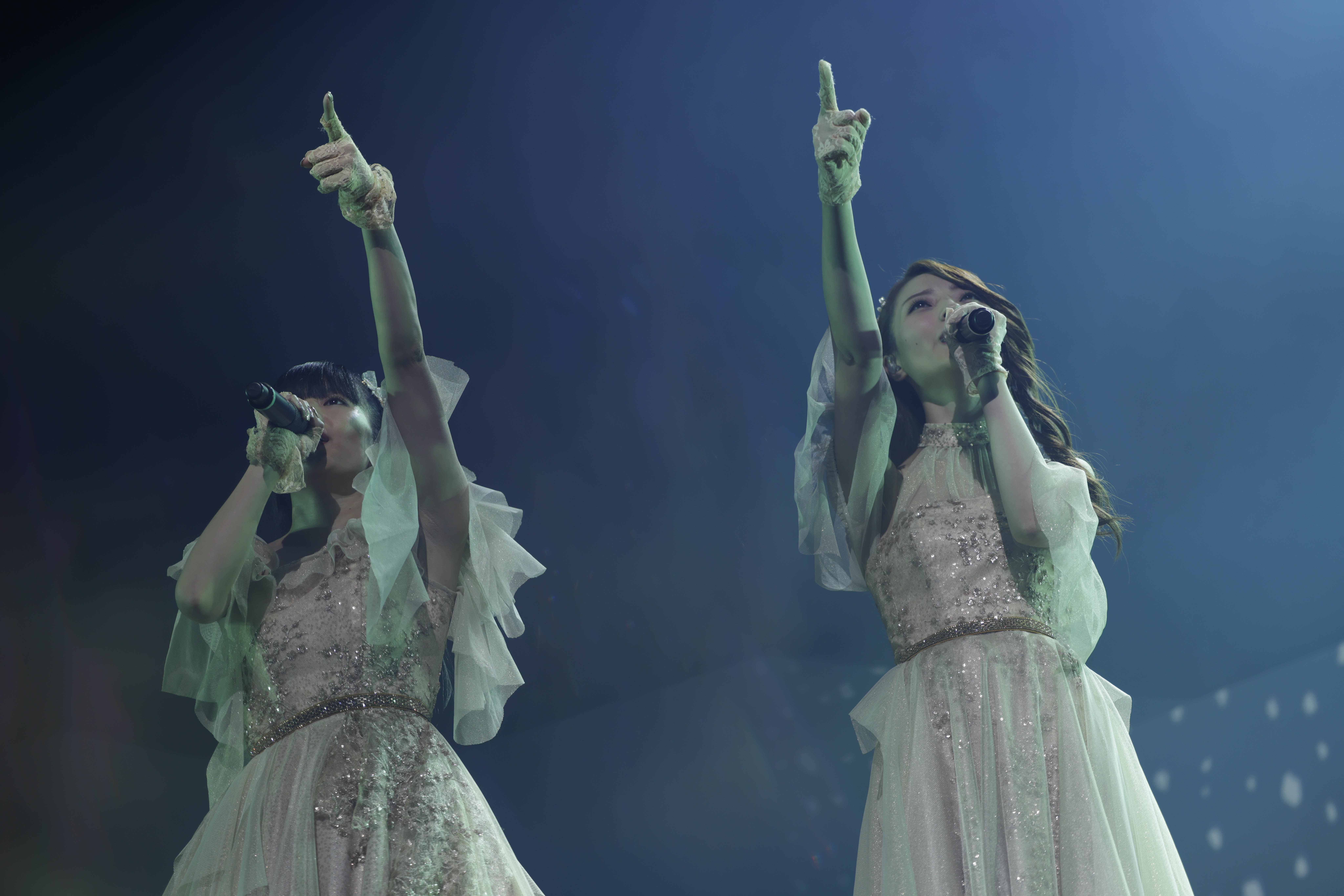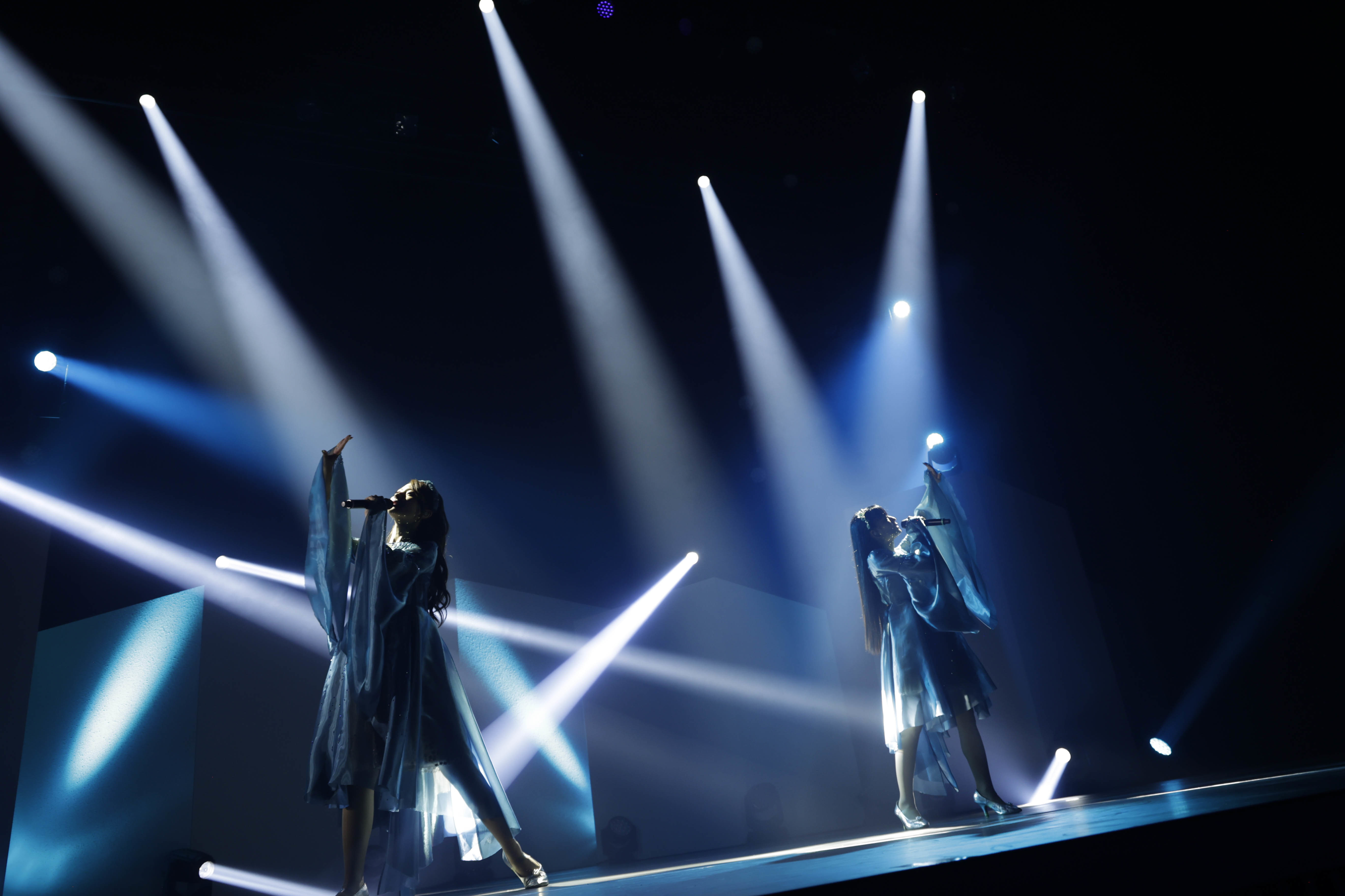 ナレーションと映像が物語の展開を告げ、青い闇と波の音が広いホールをゆっくりと包み込む。ここからは海のシーンだ。衣装替えを済ませた二人のドレスは、エメラルドグリーンとターコイズブルーの中間のような深みのあるカラーと、たっぷりとした裾や袖が波の揺らぎを思わせる。最新アルバム『Parfaitone』(パルフェトーン)から、GLAYのTAKUROが楽曲提供した激しいロック調の「瞳の中のローレライ」から、サビで一気にテンポアップする劇的な曲調の「マーメイド」へ。「瞳の中のローレライ」は、事前にツイッターで「BLUE系のペンライトで」というスタッフからのお願いがあったが、もちろん全員がチェック済みだ。ダンスも歌も照明も、ライブ序盤とはうってかわって緊張度の高いパフォーマンスが続く。