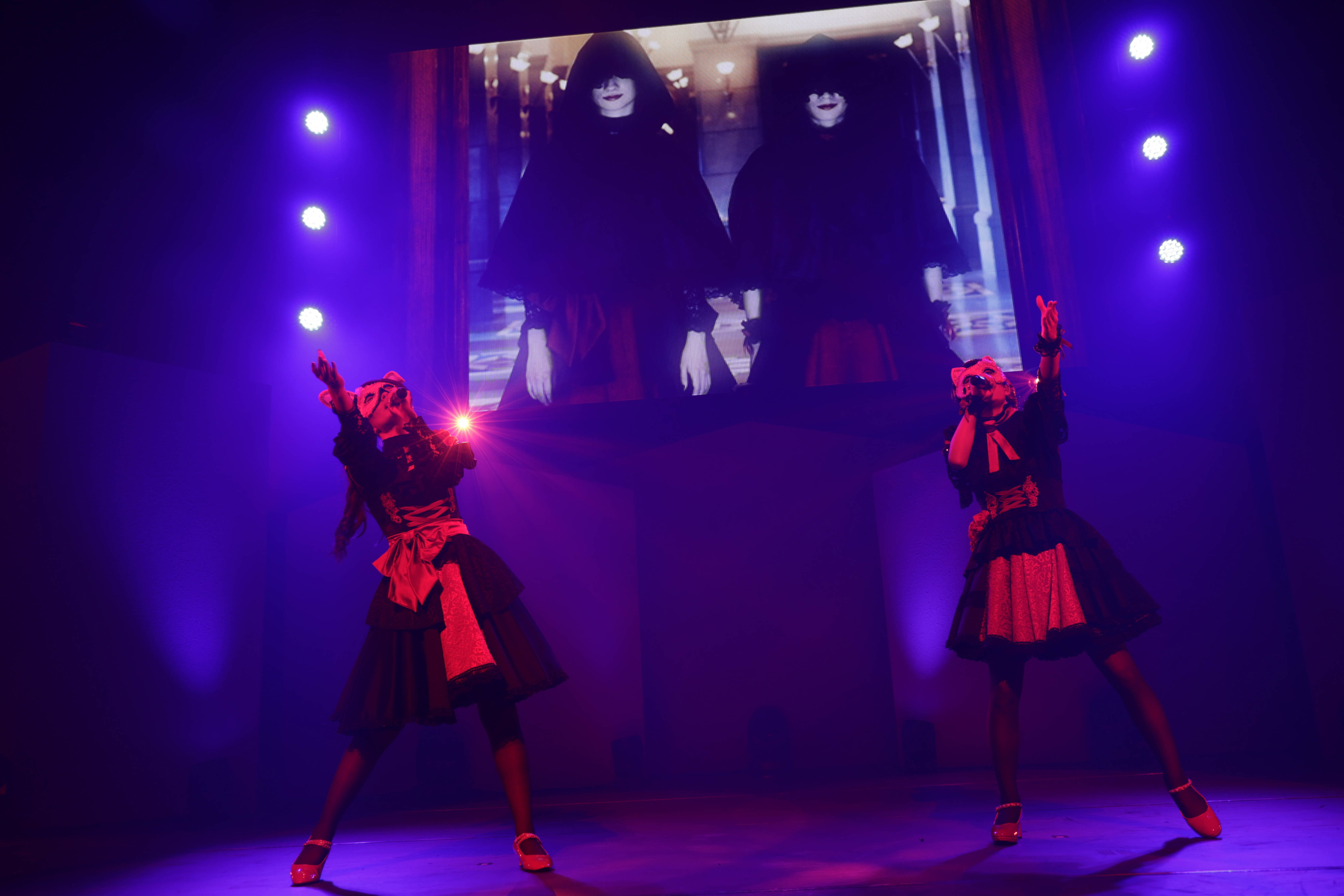 シリアスなナレーションがクララとカレンのピンチを伝え、魂を失った二人の物語は一気に不穏な展開へ。ここからは暗闇が支配するダークファンタジーの世界だ。赤と黒のゴシックドレスに着替えた二人が、仮面をつけて踊りだす。まさかこの曲をいち早くここで聴けるとは思わなかった、TVアニメ「シャドーハウス2nd Season」エンディングテーマ、9月14日リリースの新曲「Masquerade」だ。クララはうさぎの耳、カレンはねこの耳をつけた白い仮面が、可愛らしくも妖しい。ワルツのリズムと、二人が作詞を手掛けたゴシック趣味たっぷりの歌詞が、Clarisの新境地を切り拓く。シルクハットをかぶった謎の男が二人表れ、華麗なダンスパフォーマンスに加わる「シニカルサスペンス」も、薔薇やナイフや人形など、スクリーンに映る映像もゴシック&ホラーな凄みいっぱいだ。