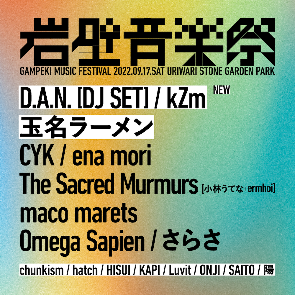 新たに発表されたのは、chunkism、D.A.N. [DJ set]、hatch、HISUI、KAPI、kZm、ONJI、SAITO、玉名ラーメン (curated by NEUT Magazine)、陽、Luvitの10組。