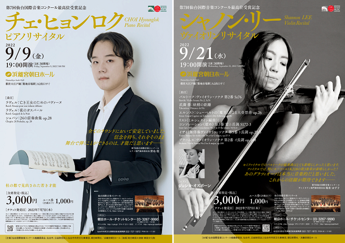 2022年9月、浜離宮朝日ホールにて、第7回仙台国際音楽コンクール(2019年開催)の最高位受賞記念リサイタルが2公演行われる。ピアノ部門のチェ・ヒョンロク(9月9日(金))とヴァイオリン部門のシャノン・リー(9月21日(水))。コロナ禍で2度の延期があり、今回が彼らにとって初のリサイタルとなる。