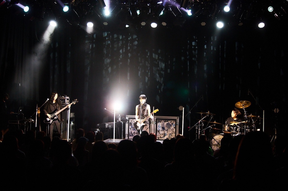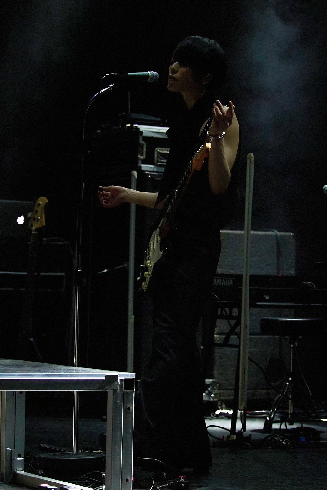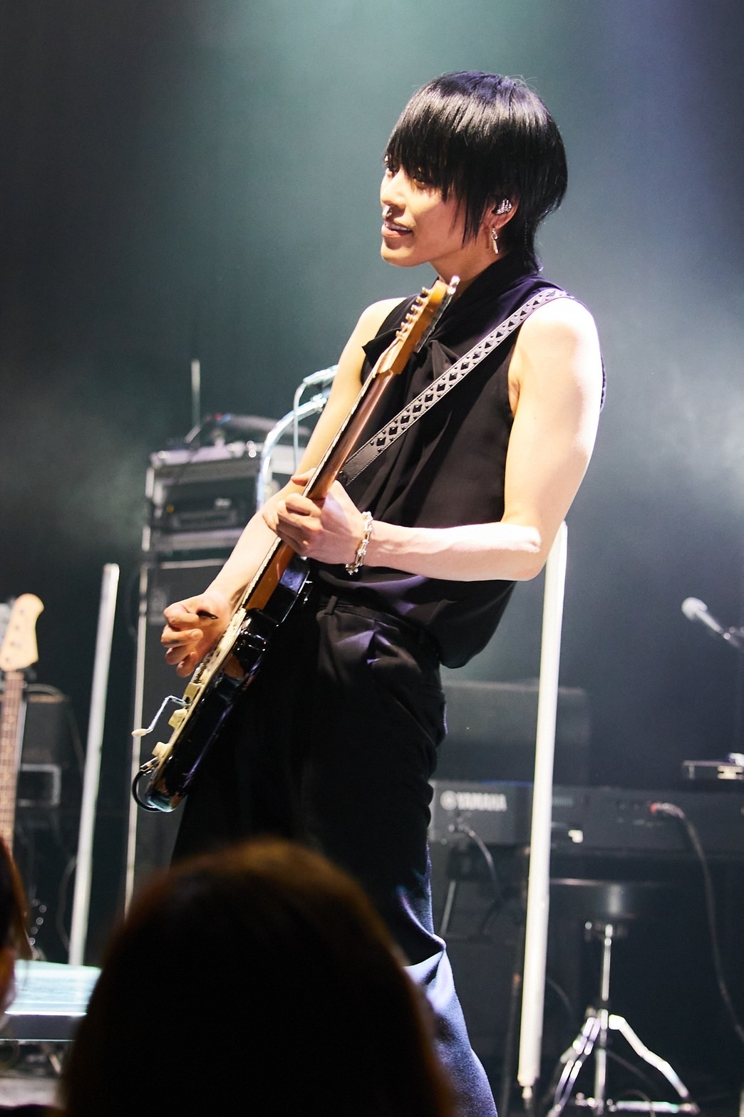 そうして、圭は次の「pitiful emotional picture.」のアクトへ。温かい光に包まれるこの曲は歌ものとインスト曲、どちらも楽しめる進行で曲が展開。まさに今回のツアーを象徴するような作品を、圭は2009年、ソロを始めたときにすでに作っていたというのが驚きだ。3人のセッションが徐々に緩やかになり、「Home sick(cover)」のおやすみソングで夜のとばりが下りると、そこからインスト「monolith.」でさらにディープな世界へ。音の浮遊感がたまらないシューゲイズなサウンドで、美しいモノクロの幻想的な世界へと観客たちは没入。そうして、曲が終わったあとも恍惚とした表情を浮かべて、遠くにいったままのオーディエンスに対して「戻っておいで! 戻っておいで!」と慌てて声をかける圭が面白かった(微笑)。このあと、1年前の誕生日は渋谷ストリームホールで『THE ELEGY-夜明けの明星-』と題したライブを1部はインスト、2部は歌ものと楽曲を分けて行なったことを振り返り「このツアーではインストも歌も、BAROQUEでやってない曲、カヴァー曲、いろんな音楽をやって。自分が作ってきた音楽の歴史を『utopia.』というアルバムが、時空を超えてつないでくれた」と打ち明けた。そうして、ライブはいよいよ終盤戦へ。