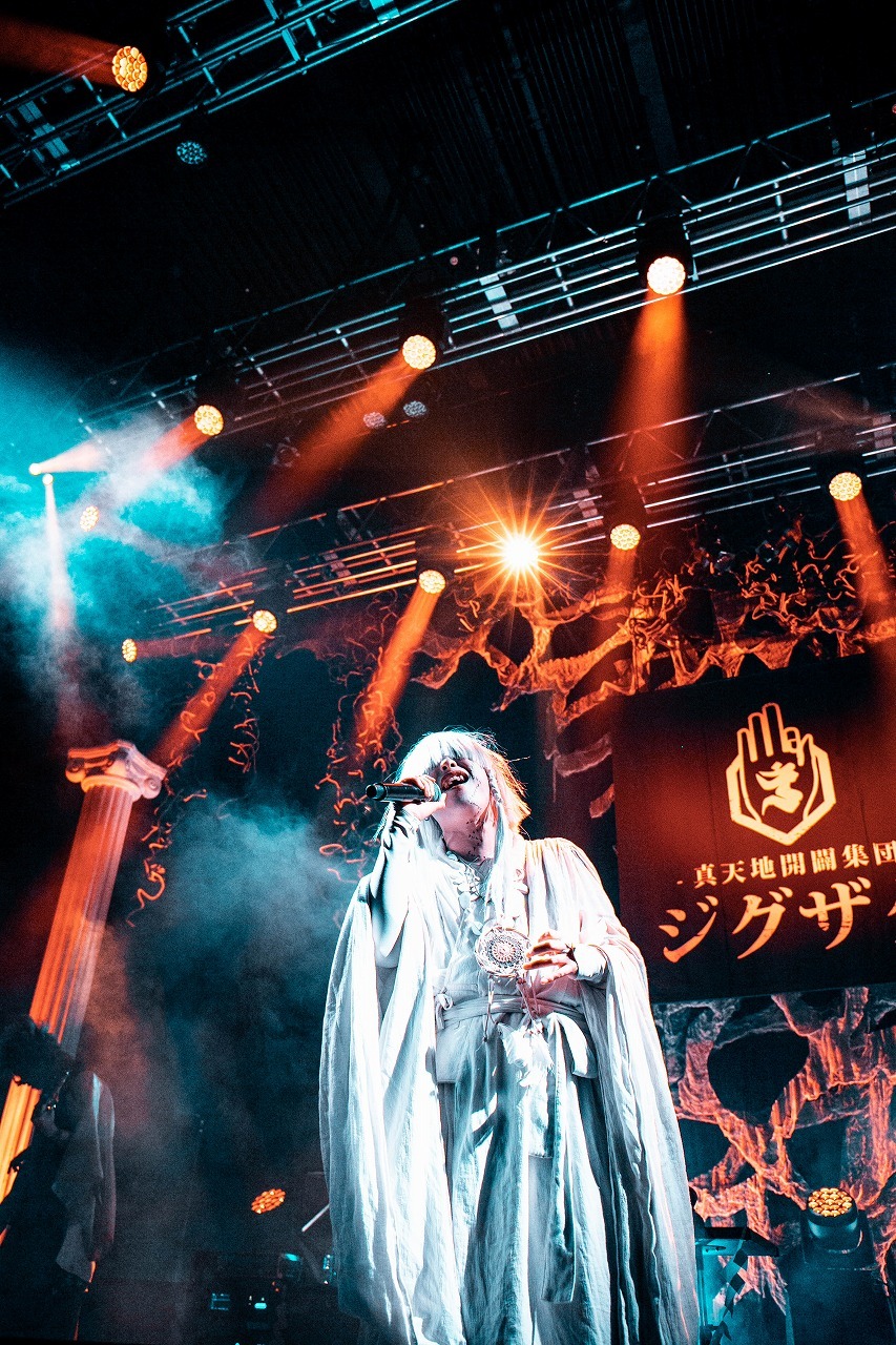 最後になってしまったが、メンバー3名のキャラクターも-真天地開闢集団-ジグザグのライブの大きな魅力なのは言うまでもない。伝道師を思わせるシックな衣裳を身に纏い、決して目を見せることがないというミステリアスなオーラとフランクなMCのコントラストが魅力的な命。端正なルックスと荒々しいロック感を併せ持った個性が最高にカッコいい龍矢。引き締まった表情でドラミングを展開しつつ内面の熱さや明るさなどがライブの随所でうかがえる影丸。タイプの異なる3人が一つになることで-真天地開闢集団-ジグザグならではのケミストリーが生まれることが印象的だ。