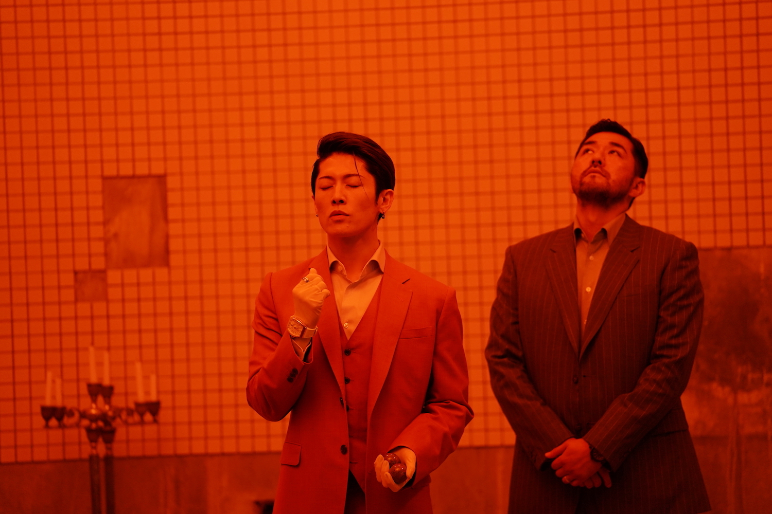 解禁された場面写真は、MIYAVI演じる十朱の姿をとらえたカット4点。十朱は、兼高が潜入するヤクザ組織・東鞘会の七代目会長で、異例の人事で組長に就任した若きトップ。 日本、アジアで勢力を伸ばすインテリヤクザであり、高い戦闘力を持つ人物だ。規則正しい毎日を過ごし、美術館めぐりを趣味とする十朱は、常にスタイリッシュなスーツを着こなし、指紋を残さないための手袋も欠かさない。解禁されたカットでは、十朱が兼高と向き合う姿や、赤い光に包まれた空間で祈りを捧げて怪しげな儀式を行う様子、趣味の美術館巡りに興じている場面などが公開されている。