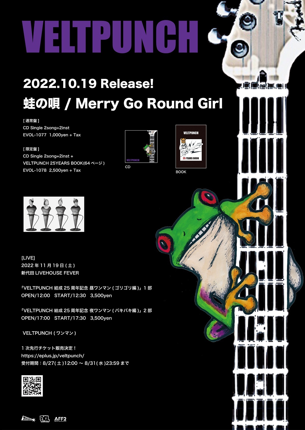 今年結成25周年を迎えたVELTPUNCHが、2曲入りCD+BOOK『蛙の唄 / Merry Go Round Girl』を10月19日に発表する。