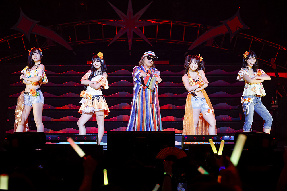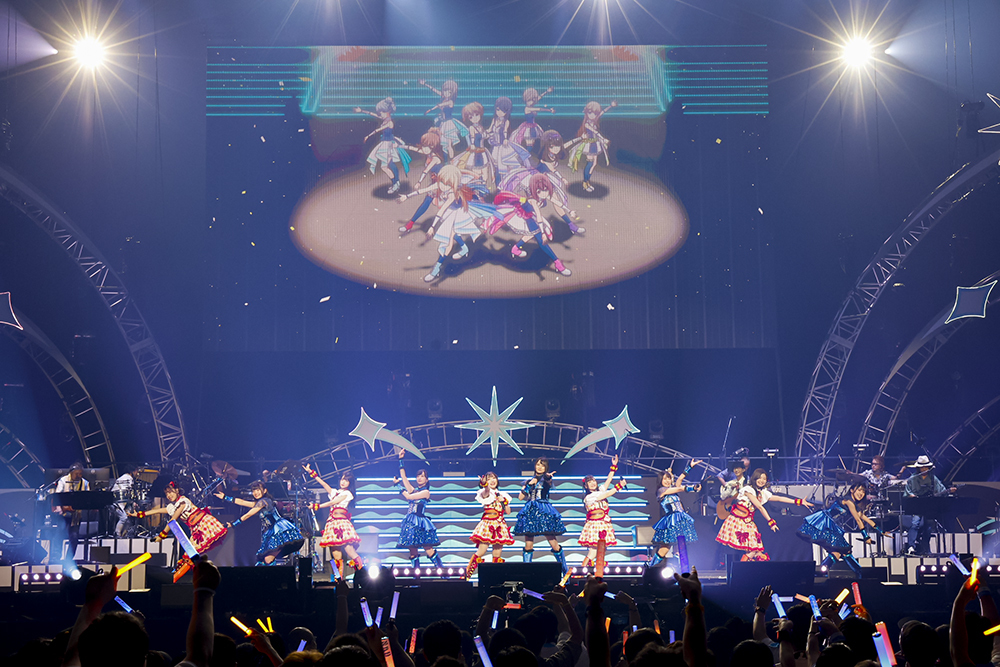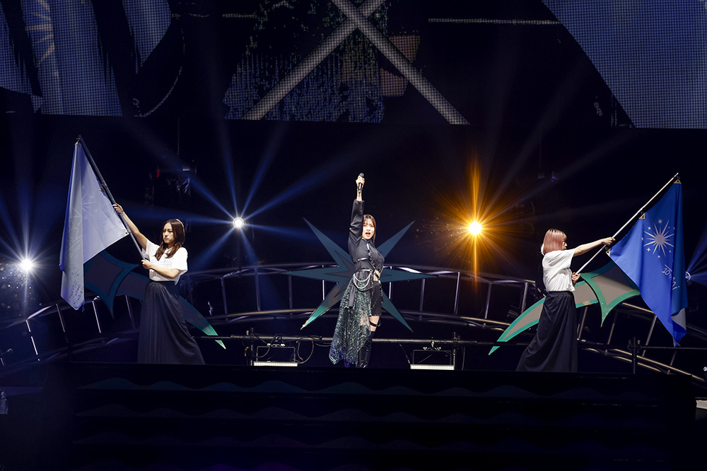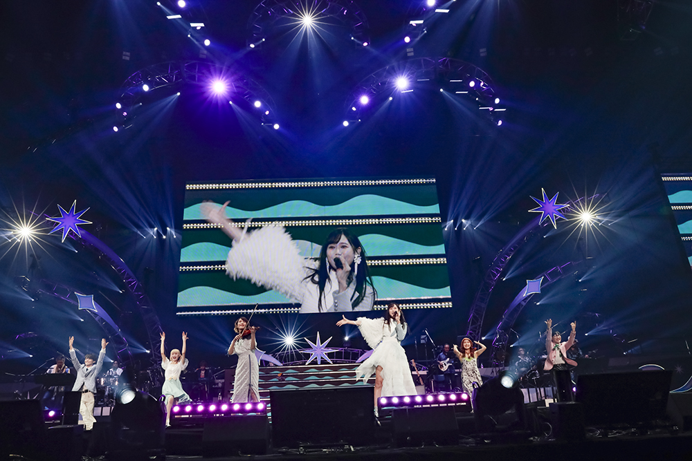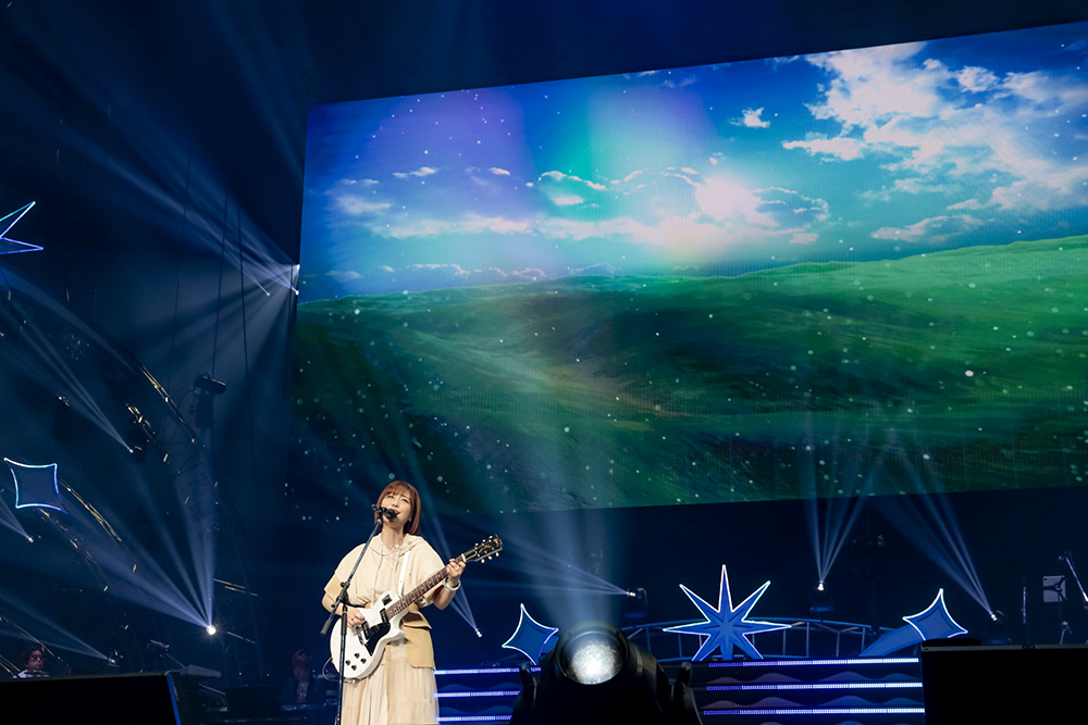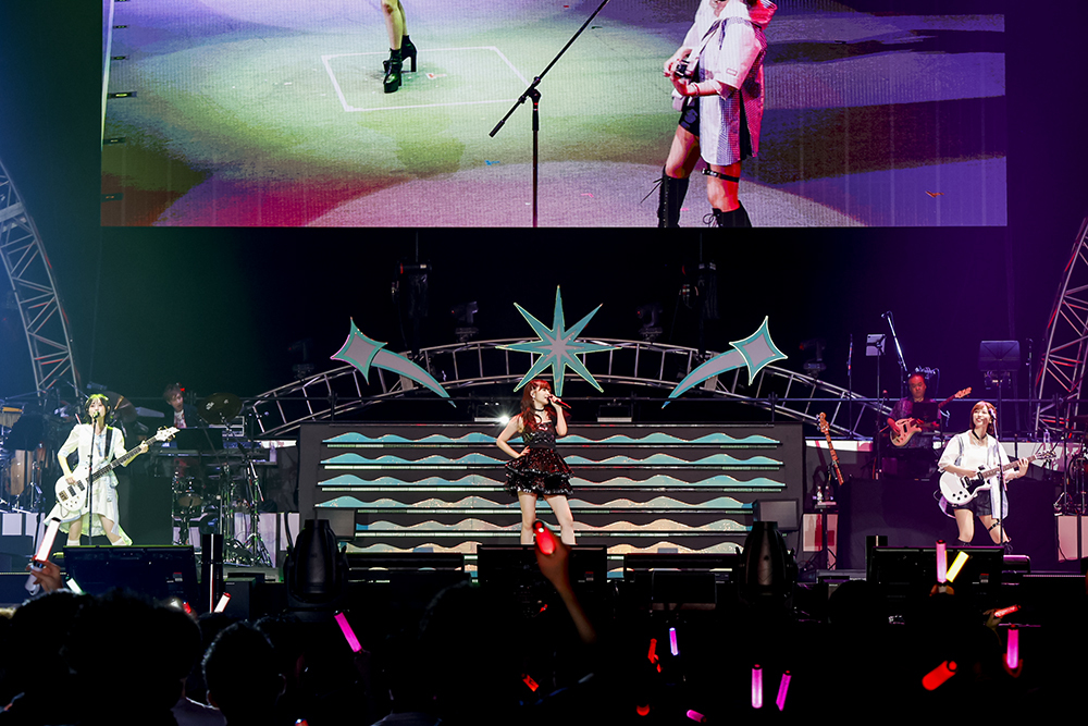 続いてはTVアニメ「IDOLY PRIDE」からサニーピース、月のテンペストが登場し、ステージを繰り広げていく。「大丈夫、きっとうまくいくから!サニーピース!」の掛け声と共にまずはサニーピースが「SUNNY PEACE HARMONY」を披露。続く月のテンペストからは「月下儚美」と打って変わってクールなナンバーで繋ぎ、そして最後に長瀬琴乃による「song for you」。一体、橘美來はどんな想いを背負ってこの歌を、このステージで披露したのだろうか。その気持ちを考えただけで胸が張り裂けそうになった。「IDOLY PRIDE」チーム、ラストナンバーの「サヨナラから始まる物語」はfeat.オーイシマサヨシとして、作詞作曲の彼がギタリストとして参加。バックで流れるアニメのライブパートと同じフォーメーションでリアルとリンクする演出は、シンプルに感動してしまう。
