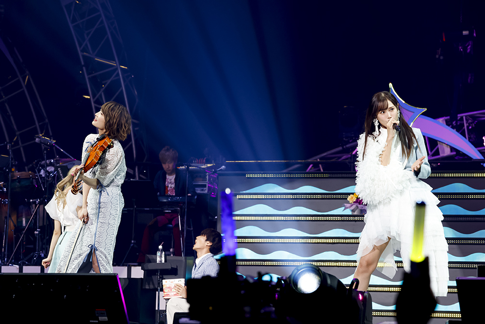 昨年に続き2度目のアニサマ登場の鈴木愛理は°C-ute時代の楽曲であり TVアニメ「きらりん☆レボリューション」第2期EDテーマの「大きな愛でもてなして」を披露。「当時はまだ10代だったんですけど、実は昔からアニメには携わらせて頂くことも多くて……。今日はようやく°C-uteの皆んなの想いを背負ってアニサマに立つことができました!」とファン泣かせのMCから「ソロ曲も歌っちゃって良いですかー!」と「ハートはお手上げ」へと続いた。ハートをあしらったピンクでラブリーなドレスから一転、シックな黒のドレスへ早着替えするも、いま自分を抜いてるカメラを即座に捕まえてウインクを投げかけたりと、トップアイドルの立ち振る舞いは未だに健在。 極め付けは愛美、中島由貴を迎えてのTVアニメ「しゅごキャラ!!どきっ」3rd EDテーマ「MY BOY」だ。ベースの中島、ギターの愛美がステージ中央からせり上がり、Buono!さながらのスリーピース構成でのカバーもニクい。「あいみー!ゆっきー!」と呼びかけ、3人背中合わせでのギターソロパートもアツい演出となった。