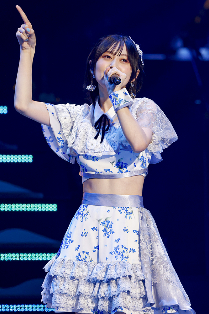 続いて登場した大西亜玖璃は、TVアニメ「精霊幻想記」EDテーマ「Elder flower」と TVアニメ「このヒーラー、めんどくさい」よりOPテーマの「ジェリーフィッシュな君へ」を披露。特に後者では「みなさんどーもーお待たせしましたーカーラちゃんの登場ですよ〜」とカーラ(CV: 大西亜玖璃)と、早着替えを終えて出てきた大西(本人)との1人2役のMCを器用にこなし、なぜかどっちの方が可愛いか?という対決をすることに。曲の最後には画面内のカーラとウインク&ピースのポーズで合わせてキメると、もうどっちも可愛い!優勝!といった感じで、続く中島由貴にバトンタッチ。TVアニメ「可愛いだけじゃない式守さん」EDテーマの「Route BLUE」は、抑揚とキレのある動きがクセになるダンスも曲調と共に特徴的な1曲だ。