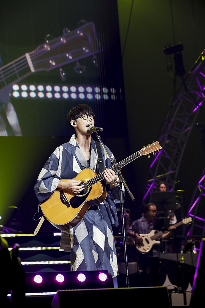 続いては「オーイシマサヨシのゆるラジ!」なるラジオ番組風の語りからオーイシマサヨシ・オン・ステージが幕を開ける。「えー、ここでお便りをひとつ。気になる人に告白したのですが、なかなか勇気が出ません。そんな僕にぴったりの曲をお願いできますか」と言った恋愛相談のお便りを読み上げると、浴衣姿のオーイシマサヨシがステージ上にせりあがり「君じゃなきゃダメみたい」の、あのファンキーなイントロを弾き出す。「アニサマじゃなきゃダメみたい!」のフレーズも飛び出した所で、同じく浴衣姿の鈴木愛理が登場。
