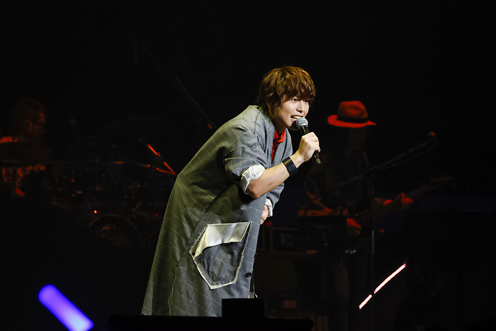 「OPで歌わせてもらったのに引き続き、ソロで仲村宗悟です!」と TVアニメ「最遊記RELOAD -ZEROIN-」EDテーマ「流転」を披露した仲村宗悟。暗闇に包まれた海辺で波に揉まれながら撮影されたMVになぞらえて「いや〜、ペンライト圧巻だね。本当に海みたいだ。」と久々に超満員のさいたまスーパーアリーナを前に感動が抑えきれない様子。「私、自分で作詞作曲で色んな曲を書いてるので、気になったらチェックしてください。それでは皆さんお手を拝借!」と拳を上に掲げて「JUMP」を演奏し、ハイジャンプと共に全身を使ってフロアを盛り上げていった。