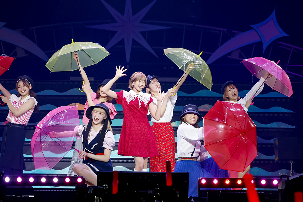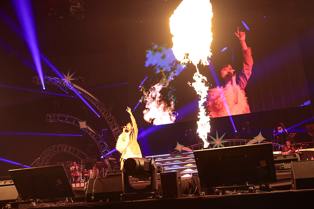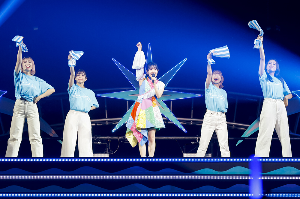 続いては賑やかなダンサーと共に斉藤朱夏が登場し「パパパ」を披露。まるでミュージカルの様なステージを展開していく。色とりどりの本や傘を使ったダンスはまるでMVからそのまま飛び出してきたかのようで可愛らしく、ラストはアニサマバンドを贅沢に使って引っ張りに引っ張り「拳をあげろアニサマー!また遊ぼうなー!」と威勢の良さも遺憾無く発揮した、エネルギッシュなステージとなった。