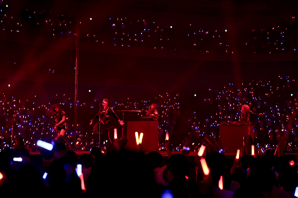 つんこの「行くよ!アニサマ!」の声から燐舞曲がアリーナ中央のステージに登場。「BLACK LOTUS」を演奏し、ガラリと空気を燐舞曲ワールドへと変えていく。これができるのが燐舞曲の強みであり、数曲の間で自分たちの色を打ち出す必要のあるアニサマのステージにとっては必須のスキルとも言えるかもしれない。またD4DJはカヴァー楽曲の層の厚さもコンテンツの魅力のひとつだろう。 「燐舞曲、始めます。」 のひと声からTVアニメ「東京喰種トーキョーグール」OPテーマの「unravel」を続けて披露すると、センターステージの強みを活かして前へ後ろへ、縦横無尽に乱れ狂うギターの大塚紗英の姿は、決してバンドリ!では見ることの出来ない彼女の一面だろう。