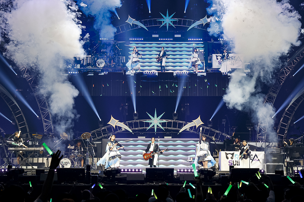 DAY1の前半戦、トリを務めるのはRAISE A SUILENだ。つい先ほどまでのパフォーマンスに負けず劣らずの夏芽のドラムソロから「DRIVE US CRAZY」に突入する。ドラムソロでタメにタメて、REYCHELLの「ウォー!」というハイトーンで気持ちが一気に高ぶる。勇ましい雄叫び1つでガラリと空気が変わる。バンドリ!という枠を超えた夏の大型フェスへの出演など、確実に大舞台での経験値が活きてることをヒシヒシと感じる。まるで讃美歌のようなコーラスはもはや神々しさすら感じられる。RASの2曲目は「Repaint」。大胆な転調があったりと初見ではややノリにくい難しさがあるこの楽曲をここで持ってくるのは攻めすぎ!と思いつつも喜んでる自分がいる。ここまで2曲終えたタイミングで「楽しんでますか?スパークルしてますか!」と挨拶を挟み、「実はスペシャルなゲストお呼びしてます!ましろ&瑠唯 from Morfonica!」と同じバンドリ!からリアルバンド後発組のモニカの2人を招聘。ここからはツインボーカル&バイオリン構成で「UNSTOPPABLE」を披露。Ayasaや進藤あまねを含めた全員でツーステ踏んでるのはレアな光景だった。