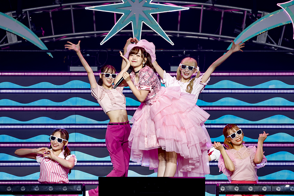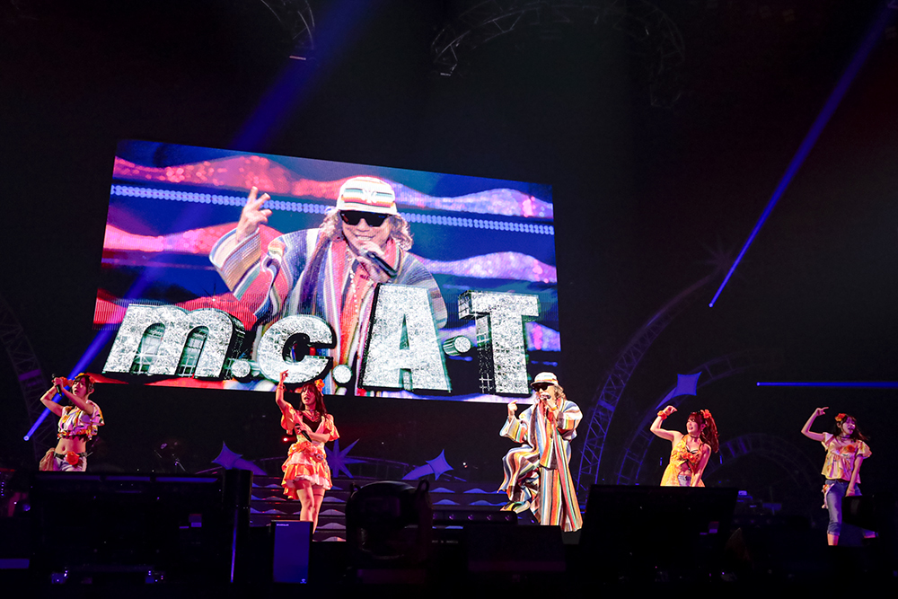 続いてはアリーナ後方からトロッコでMarm4idの4人がド派手に登場。まずは Merm4id のパーティーアンセムであるところの「Floor Killer」をトロッコ上から披露。拡声器持ってフロアを煽ったりと彼女たちは華やかな演出が本当に映えるし、この曲がかかればたちまちそこがアリーナだろうが、一気にディスコフロアへと様変わりする。メインステージへと到着する頃には、そのままメドレーでカヴァー曲の「Bomb A Head!」へと移行。2番からはサプライズゲストのm.c.A・Tも加わり、5人で上手下手へ走って手を振ると、思わず「最&高〜!」も飛び出す。 「私たちはまだまだ終わらないよ!D4DJの大切な仲間、燐舞曲」と呼び込みがあると再び燐舞曲が登場し、この間TV放映があったばかりの TVアニメ「D4DJ Double Mix」から「FAKE OFF」をライブパート映像をバックに披露した。