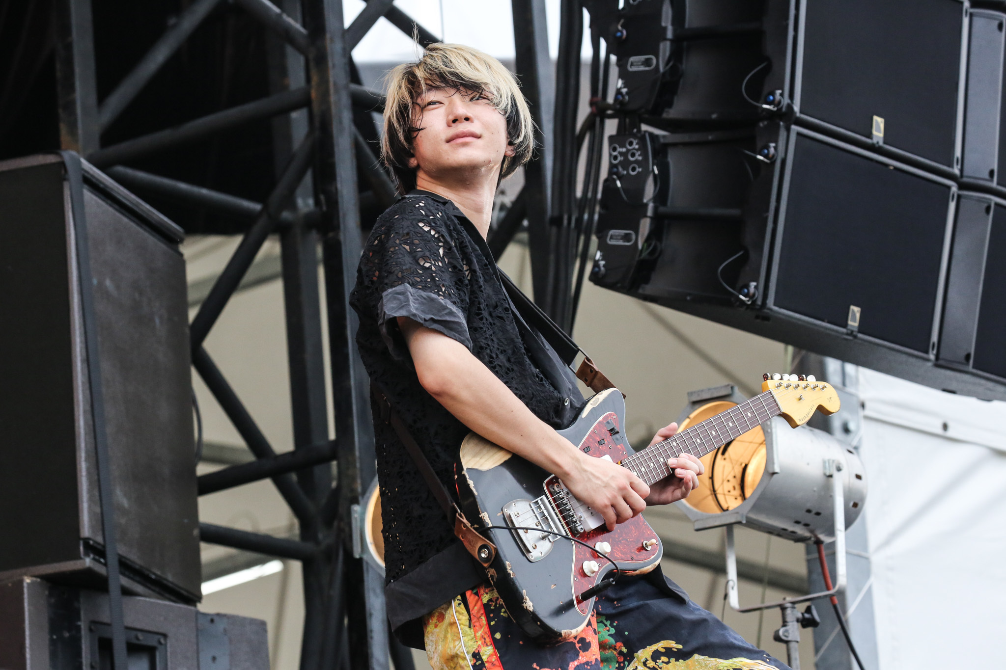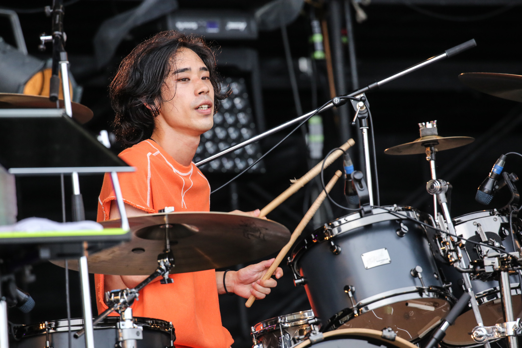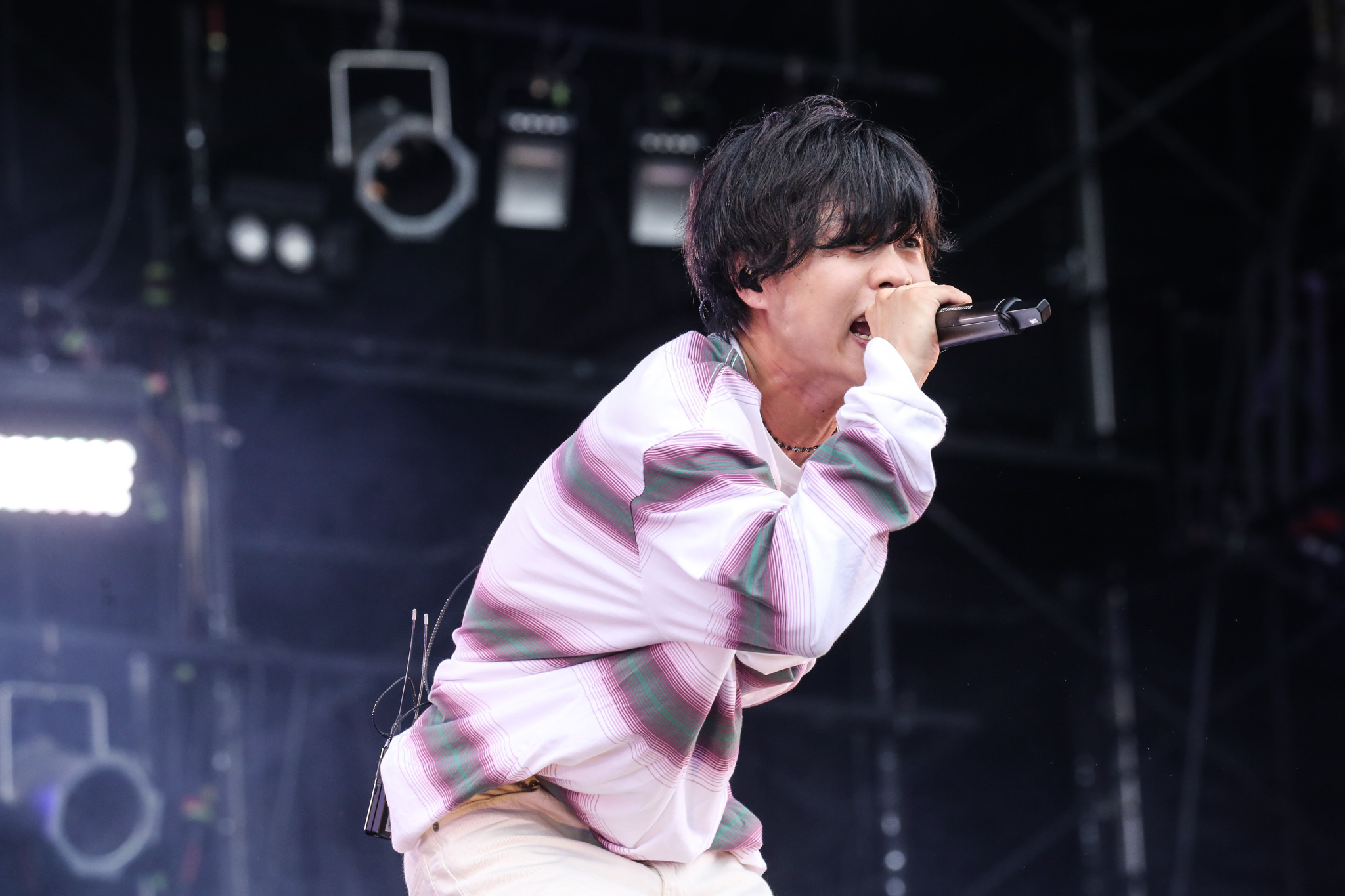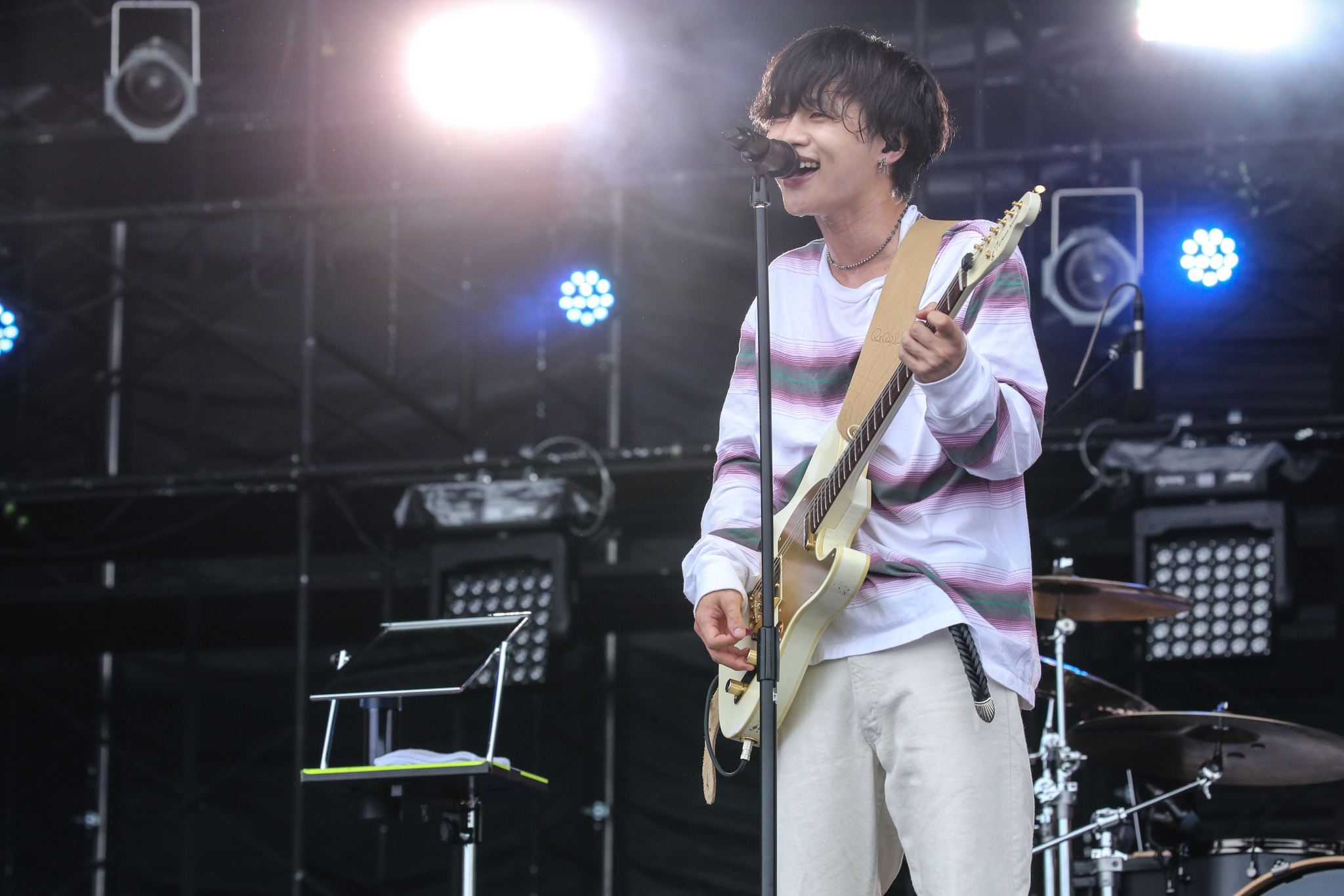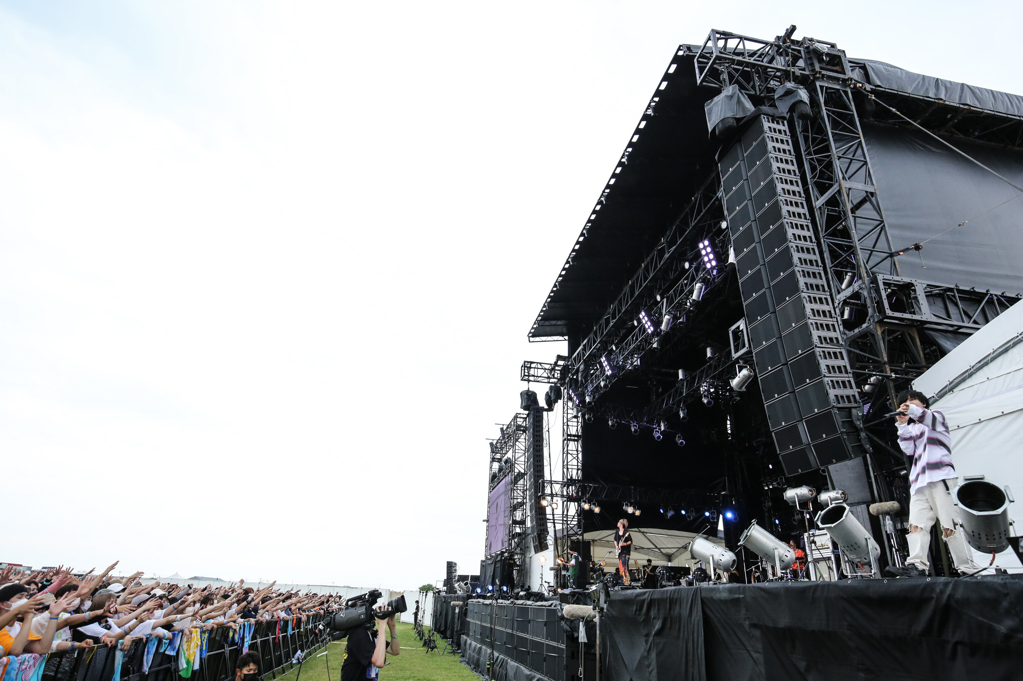 十分に引き込んだあとは「夏、始まるぞ!」(柳田)と「クロノグラフ彗星」でポップへ舵きり。柳田はカメラ目線でスマイルを爆発させ、さわやかな時間には気持ちいい風もそよぎ出す。そして柳田が「一生忘れられない夏フェスにしましょう!」と観客を誘い、次はラッパーのRin音とコラボレーションした曲「六畳の電波塔」へ。伸びやかな歌も、小気味良いラップも、しなやかなメロディもすべて浸透力が高く、後方エリアで座って観ている人たちまでもがクラップに参加。
