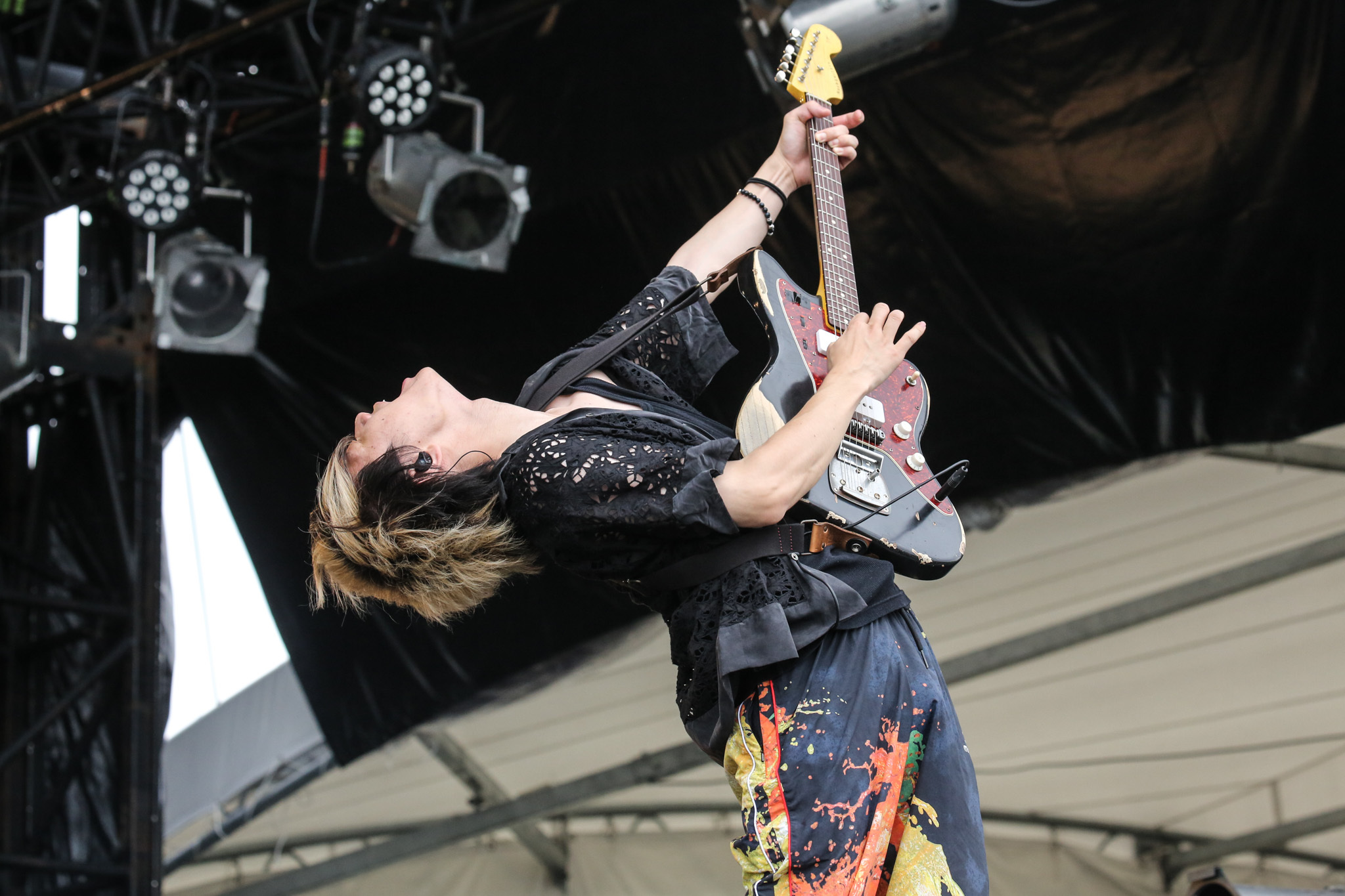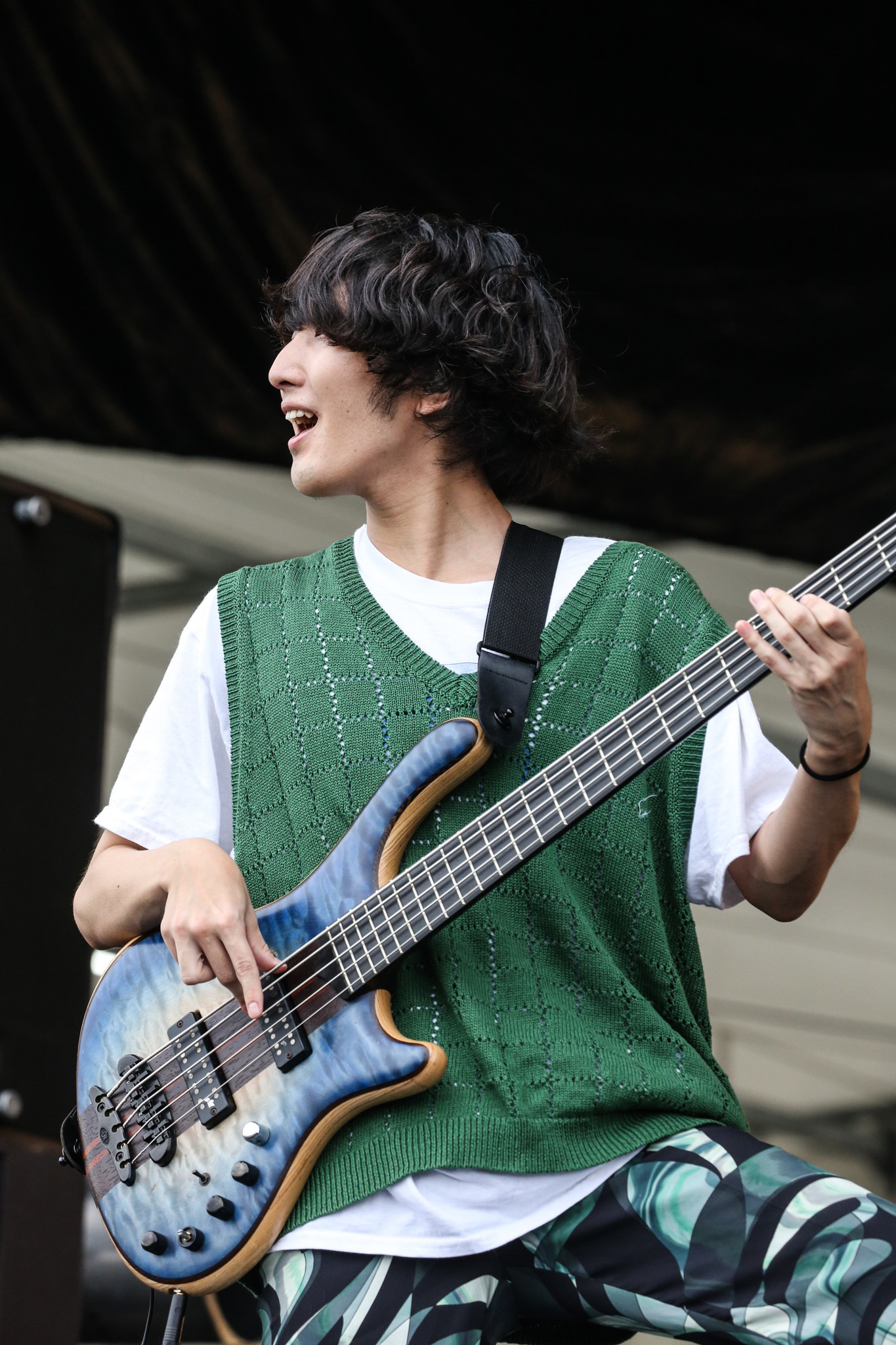 「神サイ」こと神はサイコロを振らないの幕開けは、イントロが頭上の曇天によく合う「タイムファクター」。クールに疾走するグルーヴィなサウンドは、畳みかける柳田周作のボーカルと「『RUSH BALL』!」のシャウトを武器に会場を加熱させる。続く「揺らめいて候」では鋭利なスラップベース、ギターの速弾き&キレッキレのカッティングと、力強い4つ打ちキック、艶ある歌声でよりパワーを高めて観衆を攻め立てる。