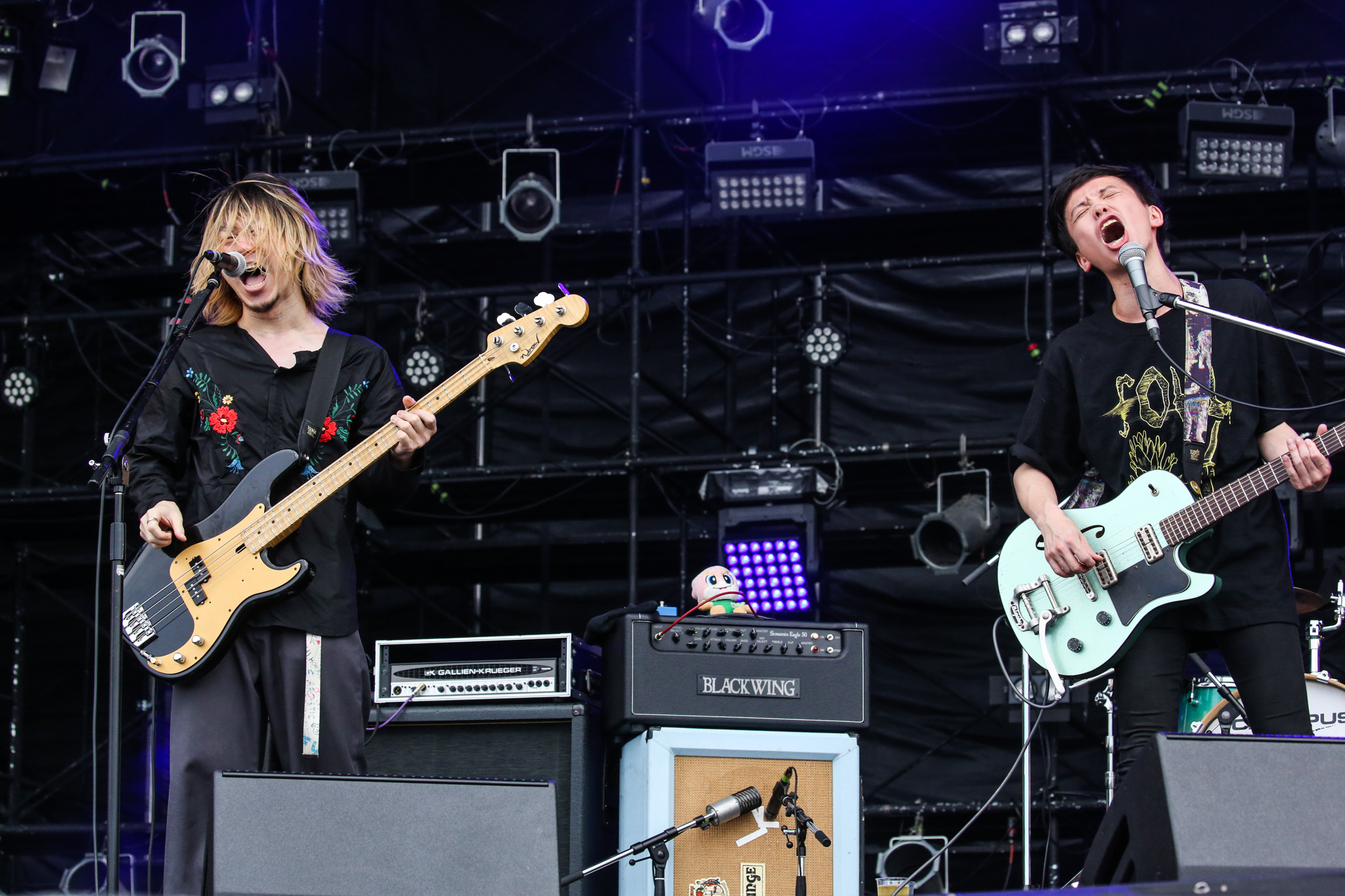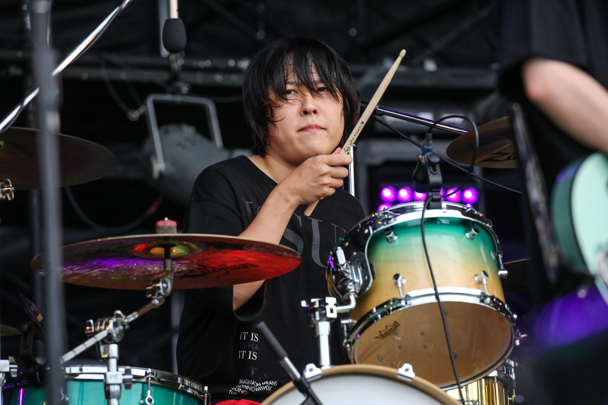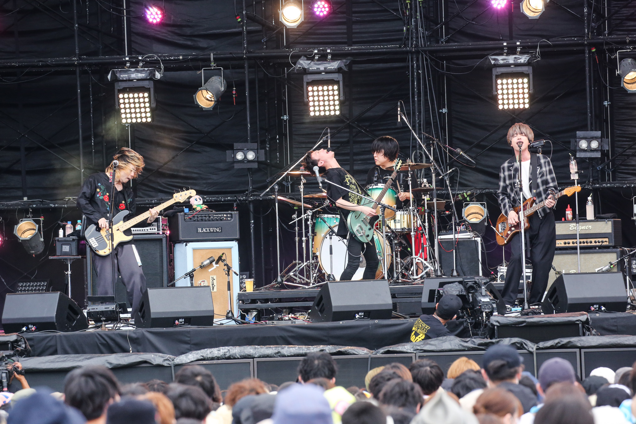 ド頭からメジャーデビュー曲「into the green」を鳴らし、フロアを沸き立たせたのはcinema staffだ。少し薄曇りの空が、ニュアンス豊かなサウンドスケープをより一層ドラマチックに演出。辻友貴(Gt)は全身をぶつけるかごとくソリッドに弾き倒し、飯田瑞規(Vo.Gt)はどこか儚くも芯のあるボーカルで、広大な泉大津フェニックスを瞬時に包囲していく。アニメ『進撃の巨人』エンディング曲にしてバンドをより高みへといざなった「great escape」を鳴らすや、その求心力を改めて実感。久野洋平(Dr)の重厚なドラムと三島想平(Ba.Cho)のアグレッシブなベースが絡まるヘヴィなビートには、腹の底から揺さぶられる感覚に陥るほど。辻はステージに転がりながら強烈な音粒を浴びせかけ、4人全員が一瞬たりとも隙のないフルスロットルのパフォーマンスで、1曲1音に全身全霊を込めていく。飯田の轟音ギターをトリガーにした「海底」では、その美メロの洪水に身を任せる多幸感たるや!