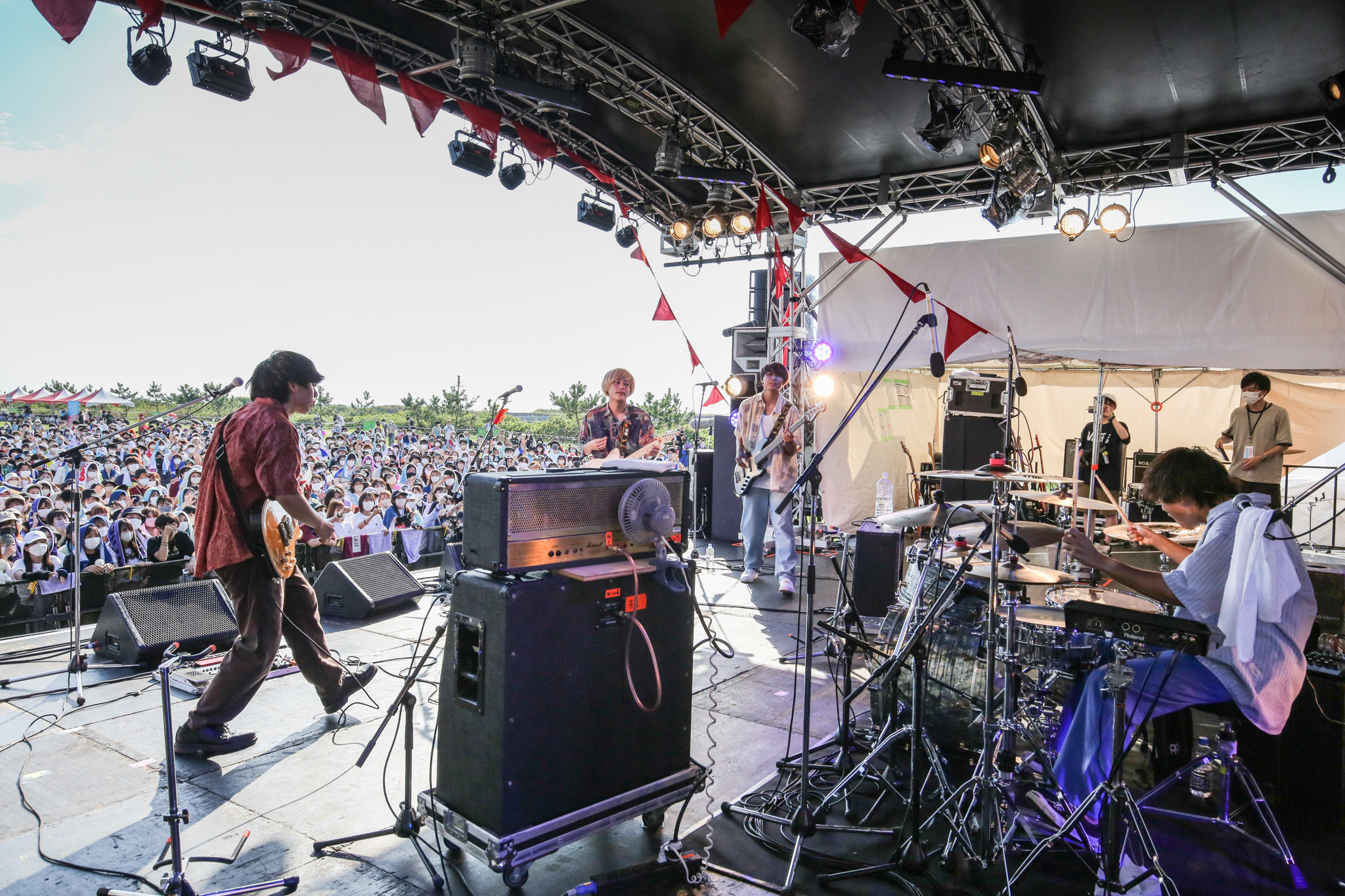 そして、<この街東京で>という歌い出しから始まる「東京」。「東京」というタイトルの歌には、外れが無いなどとよく言われる。それは何故か? 情念、熱情といった想いが込められているから。悩みもがきあがきながらも想像して明日を変えていこうとする、この歌には、40歳過ぎのおじさんライターも胸を締め付けられながら、ただただ聴かされてしまった。前後を有名バンドで挟まれて、不安だらけだったという初の大型野外ライブイベント。それでも「嫌なことを、憂鬱なことがあっても楽しい日が来るのを僕らが証明します」と言い切る。来年の大きなステージの出場も、まんざら夢ではないと想えた。