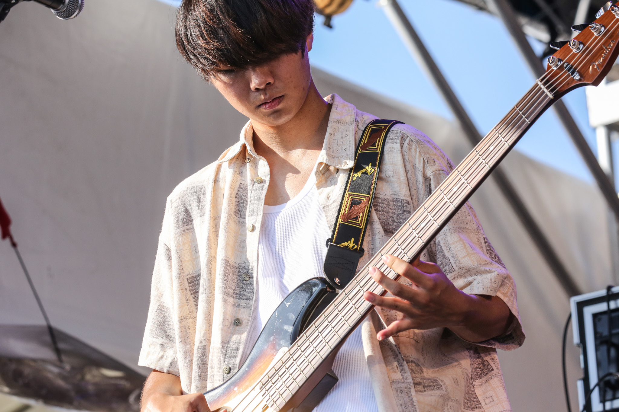「こんな日だから、暑い日だから、まだ夜じゃないけど」とボーカルのかやゆー。が言って、「8月の夜」から歌われる。たくさんの観客がサウンドチェックから集まっていたが、その理由がよくわかる始まり。しっかりと自分で物語を作って、魅せて聴かせることができる。平均年齢弱冠20歳のヤングバンドながら、この大舞台でのさらりとやってのけるのは天晴れとしか言いようがない。駆け抜けるスタートダッシュ。申し分の無い1曲目であった。