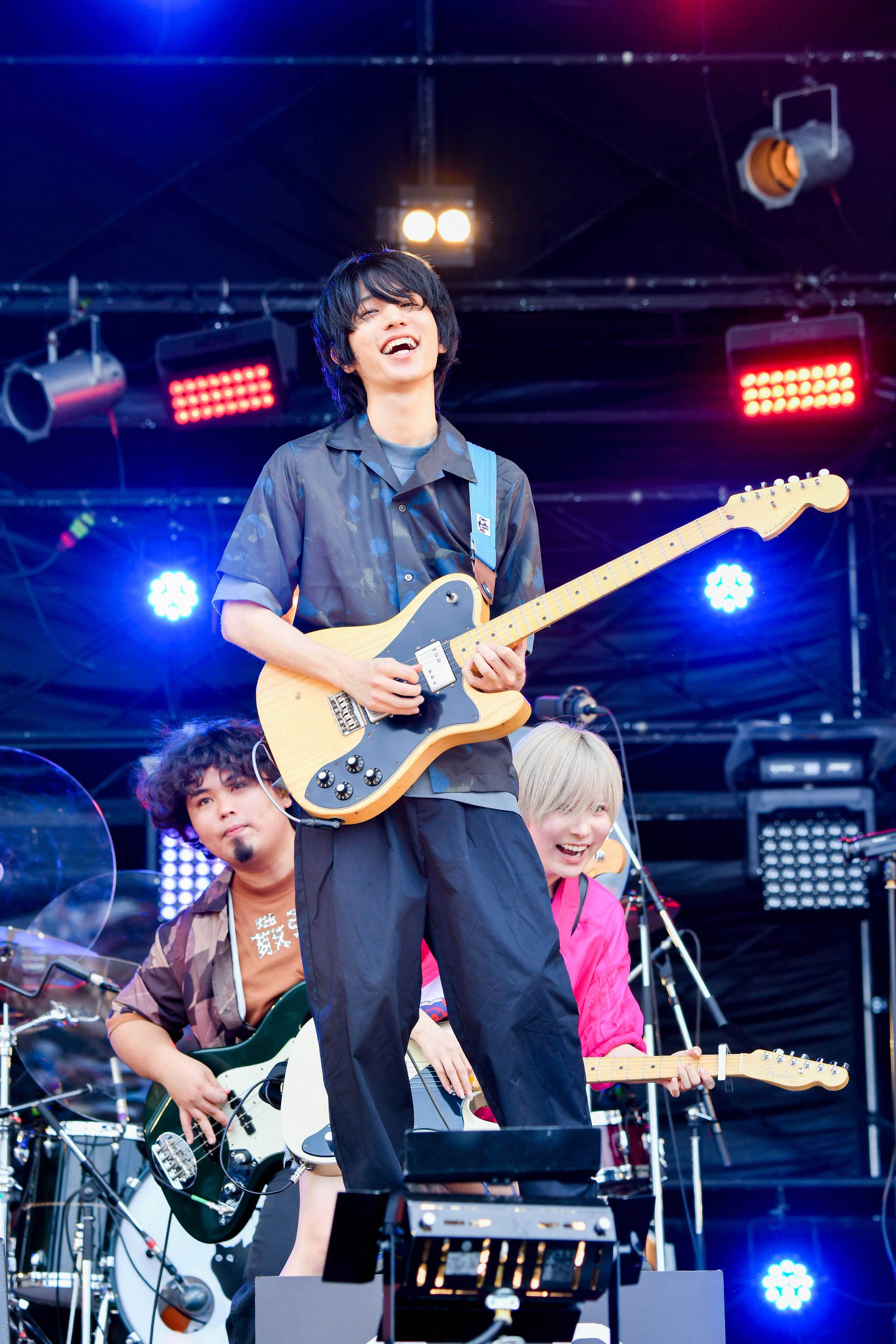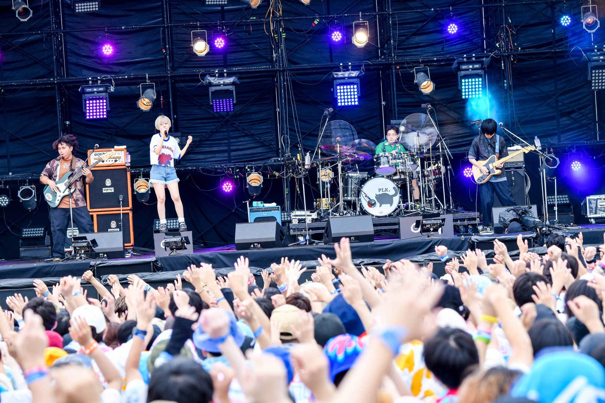 そんな猛攻を見せる彼らは「今年唯一の夏フェスなんです。気合入ってるよ!」(雫)と期待させ、目を輝かせたファンへの贈り物とばかりに9月7日(水)発表のニューアルバム『踊る様に』から「リドー」と「ツキカゲ」というスピード感十分の2曲をセレクト。途中ワルツのリズムが刻むワクワクや、どこか怪しげなメロディ、両手を大きく広げハンドマイクで甘い声を響かせる雫の姿など、目も耳も釘付けだ。加えてどっぷり「ポルカワールド」にハマる人々をより深みに誘うように、ここからは人気曲の連投へ。まずは雫の「飛べっ!」の号令から「テレキャスター・ストライプ」。スイートなボイス&ギターと心地いいリズムは、オーディエンスに弾ませ、躍らせ、手拍子させ、これぞライブのお楽しみといったところ。当然メンバーのビッグスマイルもモニターに映し出される。