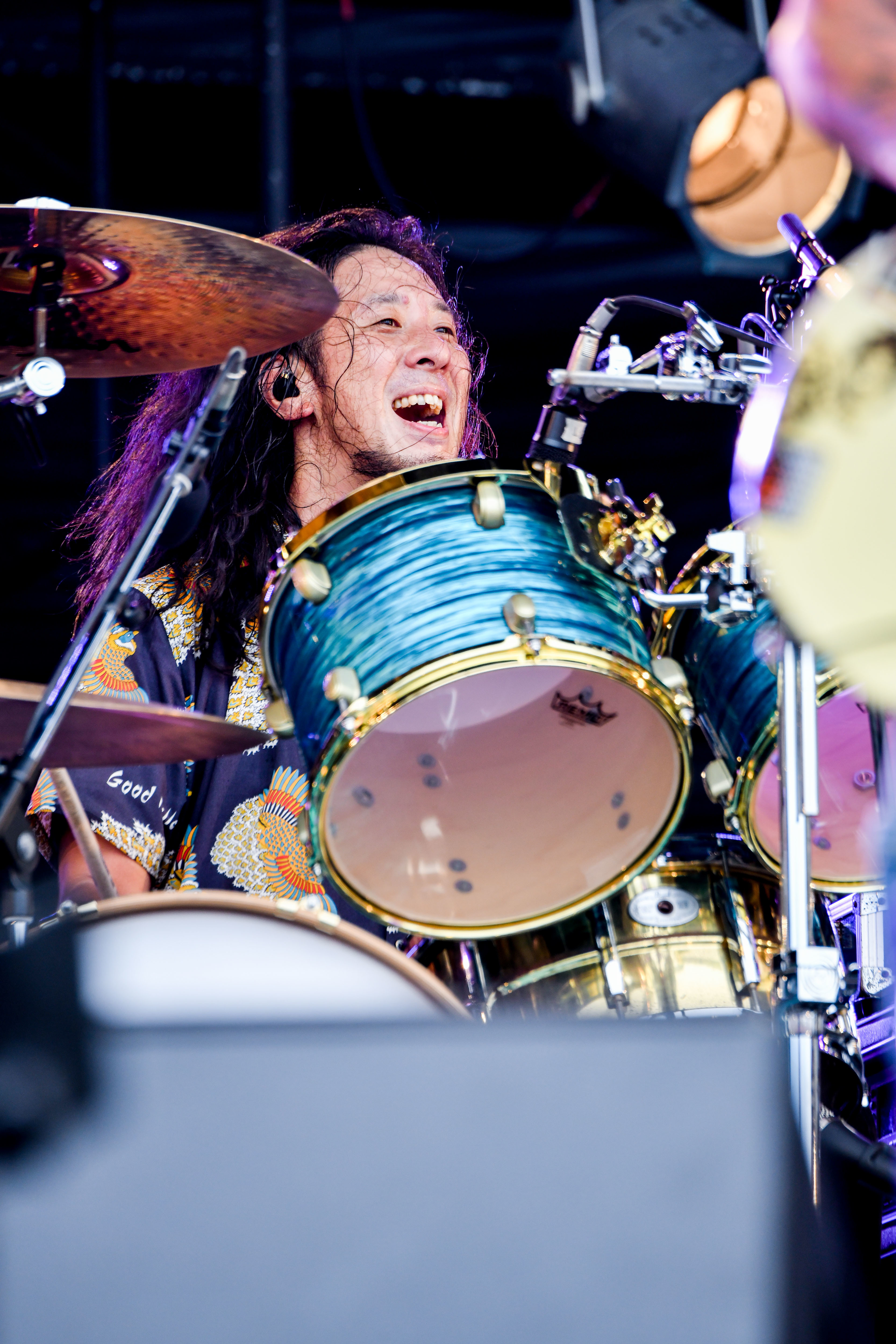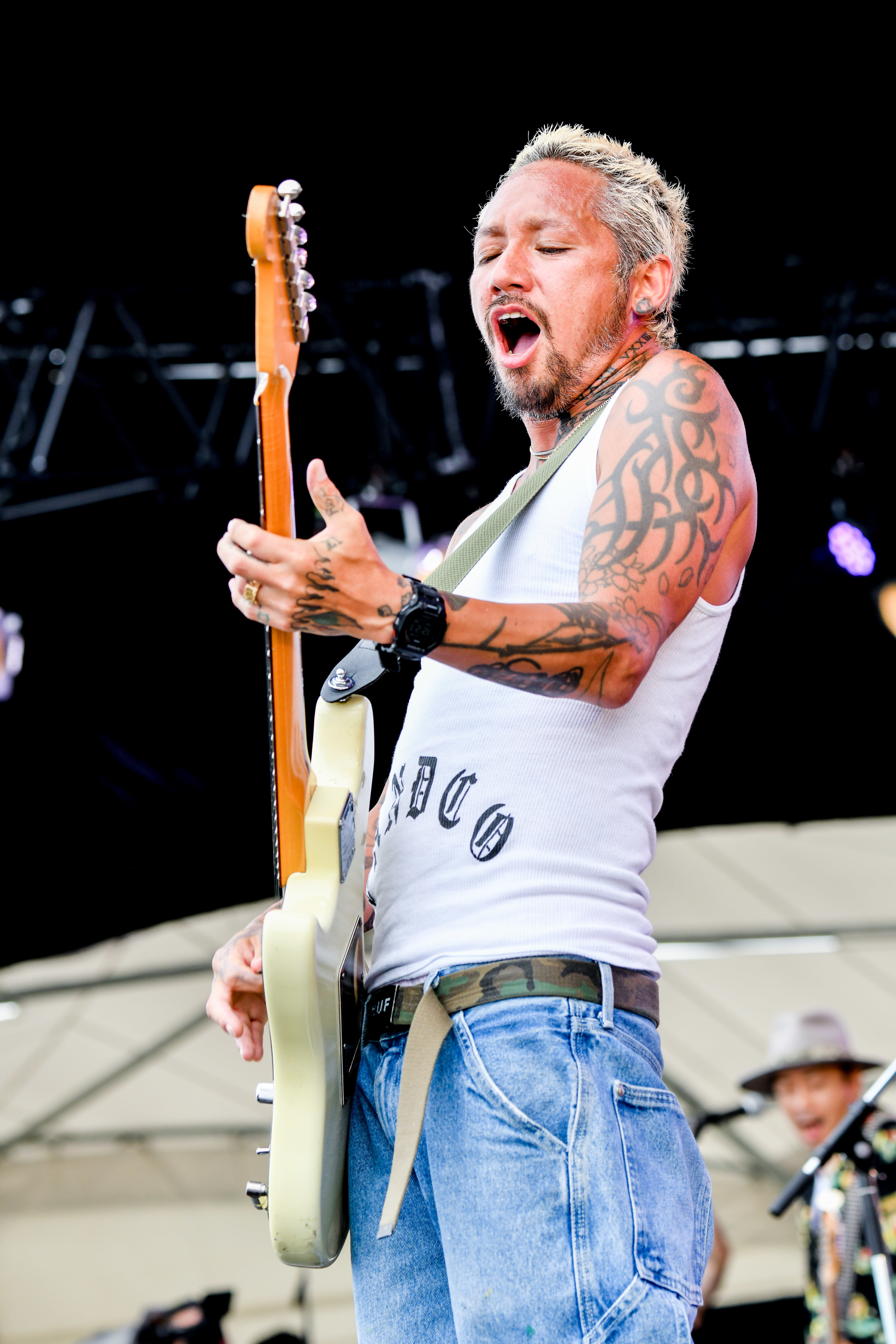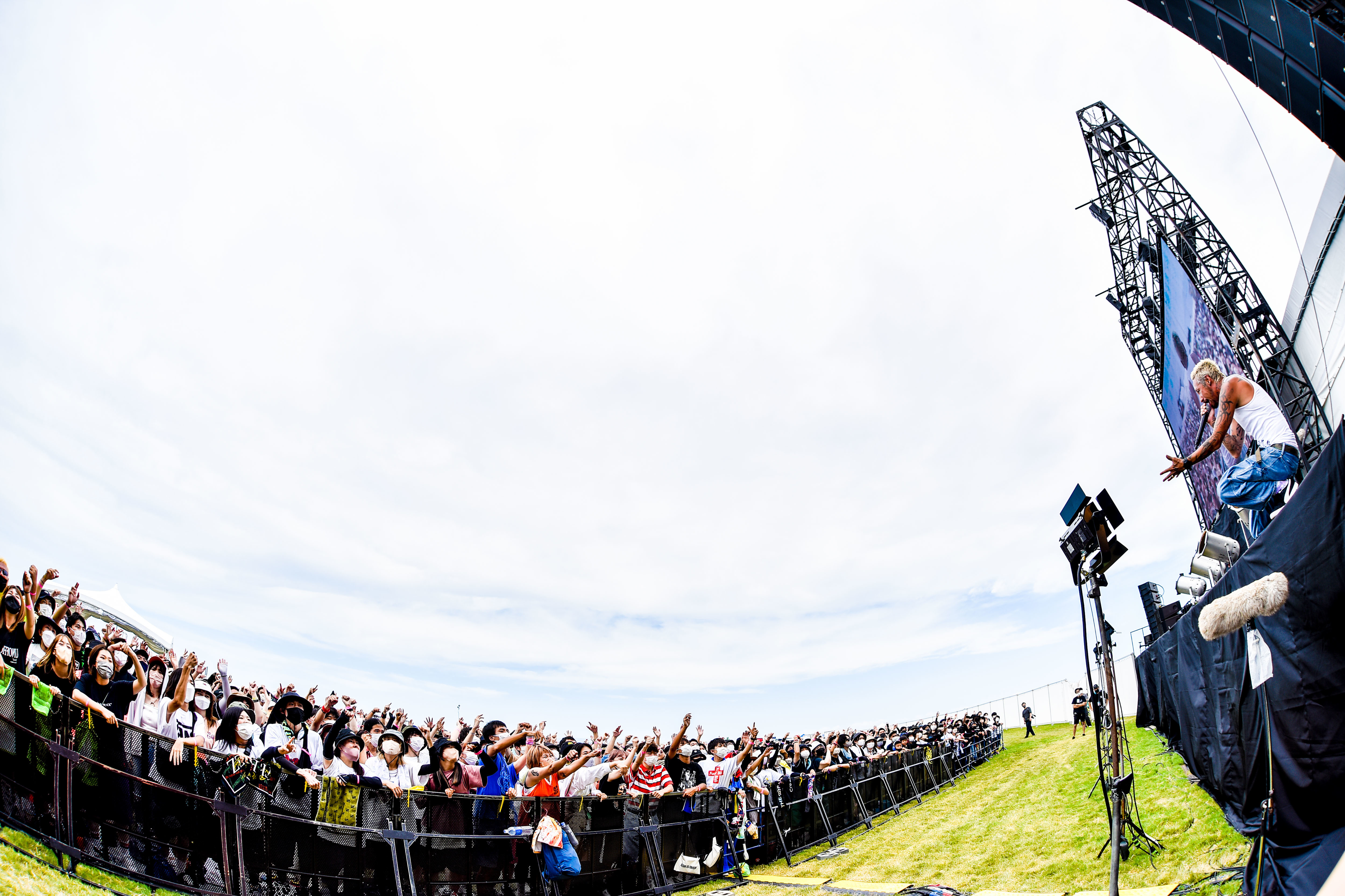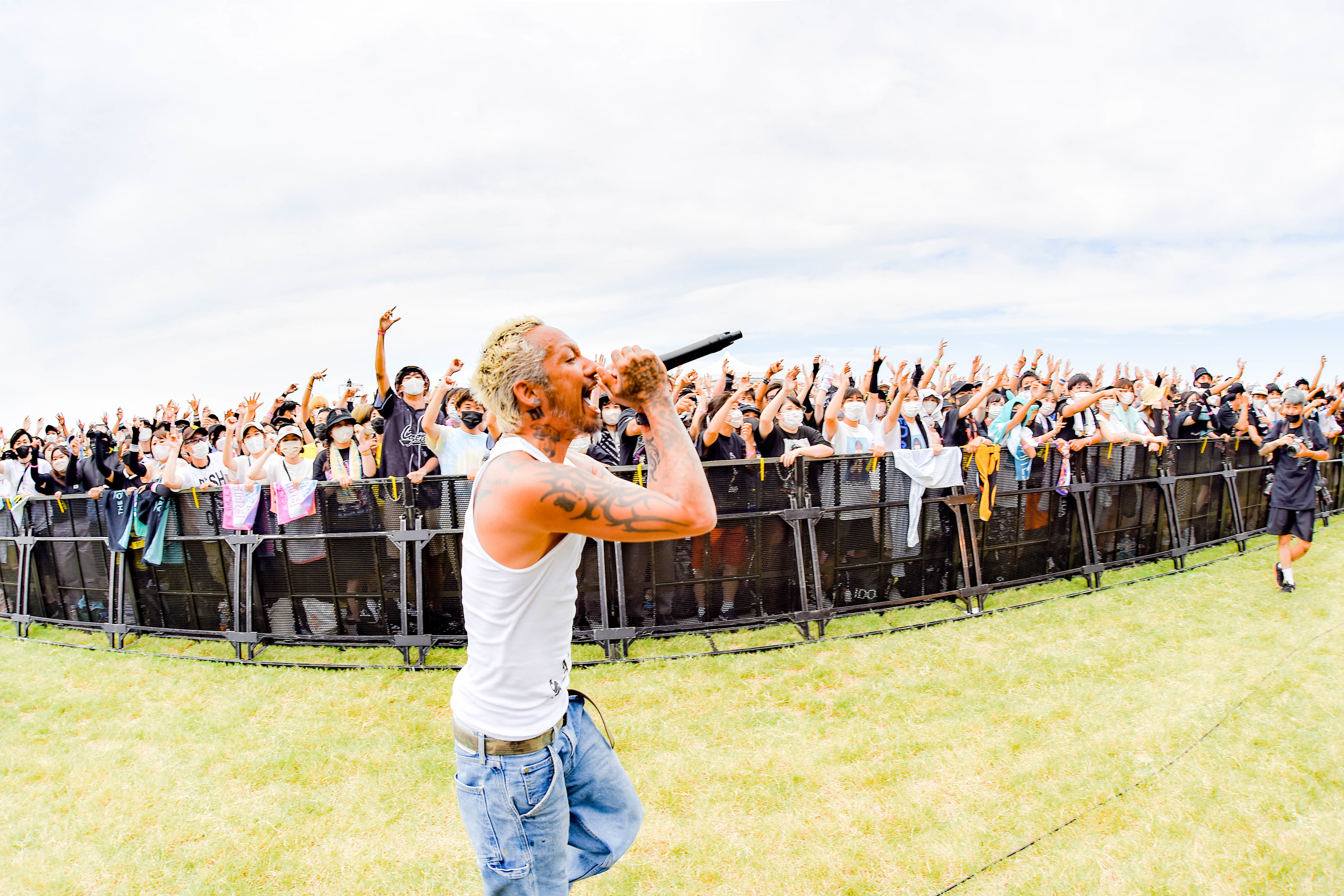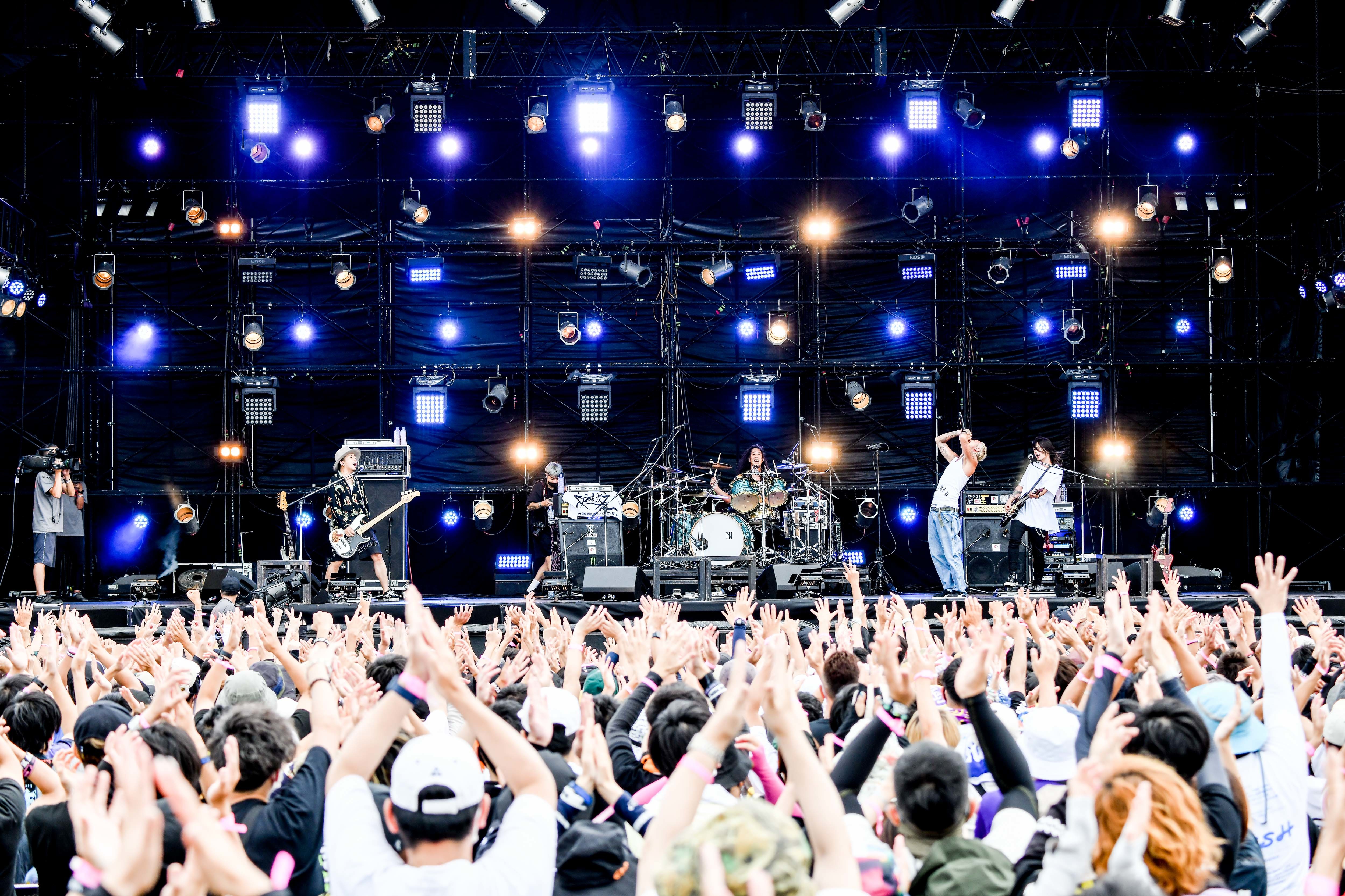 イントロから歓声が聞かれた「Thread & Needle」では、「この日をどれだけ待ったか!」と口にし、9年前に作ったというこの曲を「今日のこの日に繋いだと信じてます!」と投げかける。曲中、JESSEは感極まったように目を輝かせ、愛おしそうな表情でオーディエンスを見つめていた。ラストの「SUNTOWN」では、高まったJESSEがステージから飛び降り、同じ目線で音楽の喜びを味わう。さらに「音楽がお前ら俺らを救う瞬間、お見せしましょうか! 本当に良かった! 信じてて!」と叫び、魂を込めて熱く向き合った。最後は4人がステージで手を繋ぎ「GREENS! 力竹! ありがとうございました!」と、『RUSH BALL』プロデューサーのGREENS・力竹への感謝を伝え、深くお辞儀。ジャンプで巻き起こる砂埃、コール&レスポンスができる開放感と震えるような一体感。全てが懐かしく、美しかった。この日のライブがどれだけのものだったかは、写真に写る4人の表情が全てを物語っている。