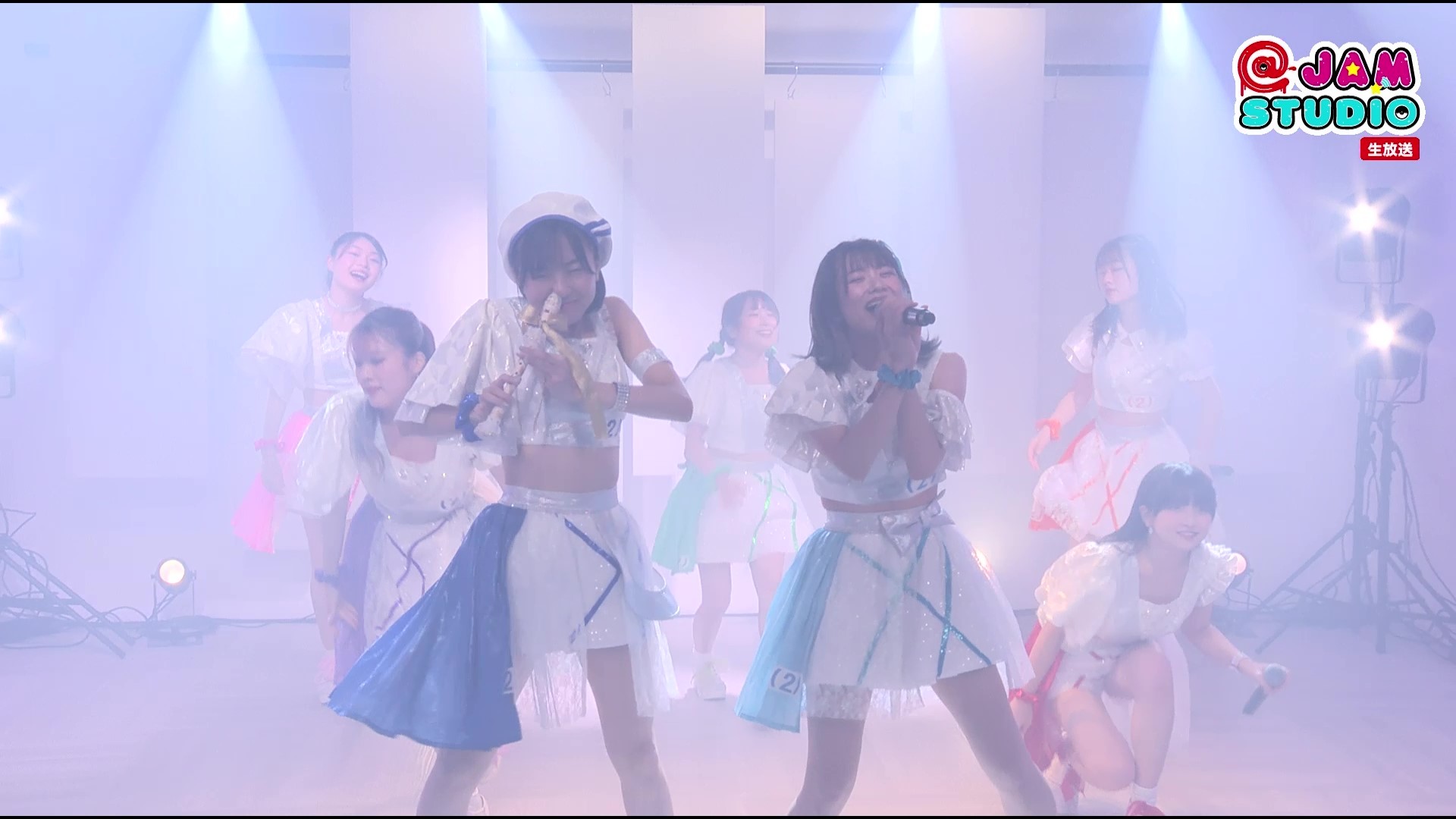 スタジオライブ1曲目は「だれだって、アイドル」。スタジオ内には薄っすらとスモークが焚かれ、いかにも生配信といった雰囲気のカメラワークがパフォーマンスを捉える。自分にカメラが向いた瞬間を逃さずにパッと華を咲かせる7人の笑顔が眩しい。