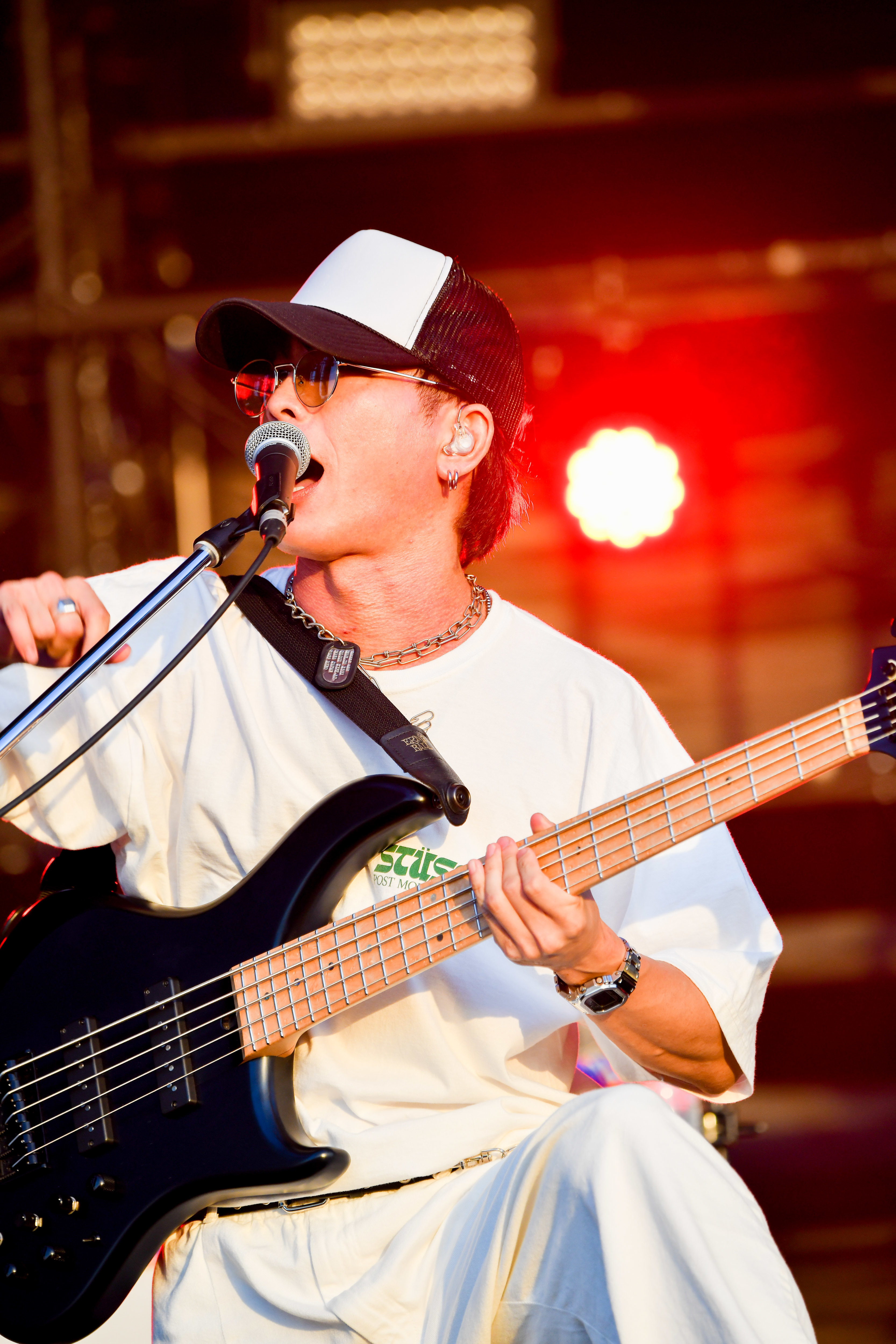 「声出せるようになったらしいやん! 今まで溜めてたもの、全部出してこいよ!」と山中拓也(Vo.Gt)が声をかけると、それを合図に歓声が上がり、会場の熱気は一気に上昇。初っ端から煽るだけ煽ったんだから1曲目への期待は大きい……。観客の視線も、耳も感覚も研ぎ澄まされたなか、「さっきのステージ(SiM)は悪魔でしたっけ? ほんなら大魔王でも参上させましょか!」と披露したのは、まさかの「大魔王参上」。初期のライブ定番曲だけど、最近ではなかなか披露されないレア曲だ。一発目にこれが来るの!? と観客は大興奮で、芝生の地面が大きく揺れるほどの高いジャンプで音に応える。あきらかにあきら(Ba.Cho)のおなじみの脚上げ、この日も見事な高さだ。