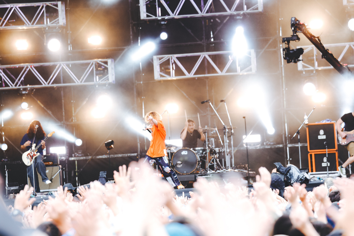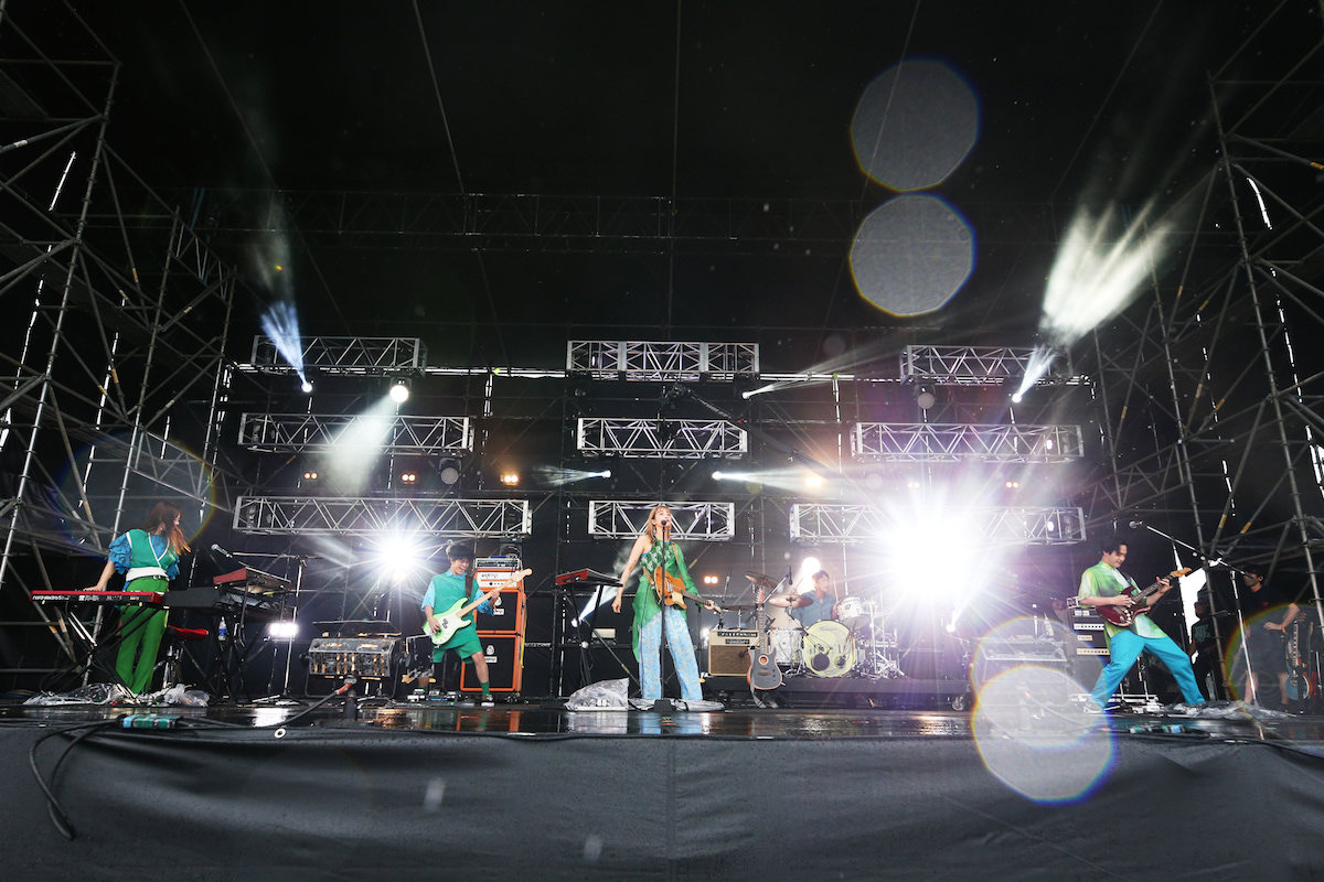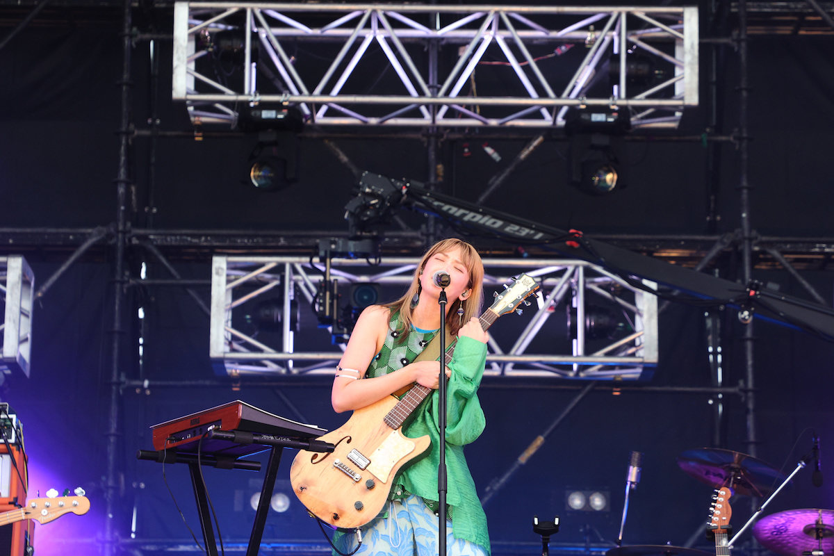 LAKESIDEから最終日の幕開けを告げる音楽を鳴らしたのは緑黄色社会だ。雨が降る中、peppe(Key)の奏でるイントロからバラード「ブレス」をしっとりと届けるオープニング。ボーカルにぴったり寄り添うコーラスも含め、バンドの絆を感じさせる演奏に乗って、長屋晴子(Vo/Gt)の歌が広い会場に行き渡っていった。そして2曲目は「Mela!」。小林壱誓(Gt)と穴見真吾(Ba)がバトルするように楽器を弾くなど演奏は情熱的で、観客もリズムに乗って腕を振ったり手を叩いたりと楽しそう。この3年間でのバンドの飛躍を象徴する光景だ。「sabotage」までを終えると「どう? 最初から飛ばしてみたけど温まった?」と長屋。「後ろの方、聞こえたらかわいいハート作って!」とハンドサインで観客とコミュニケーションをとりつつ、「音楽だったり隣の人だったり、いろいろなラブを感じて過ごしてもらえたらと思います」と伝えた。