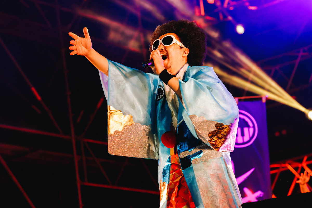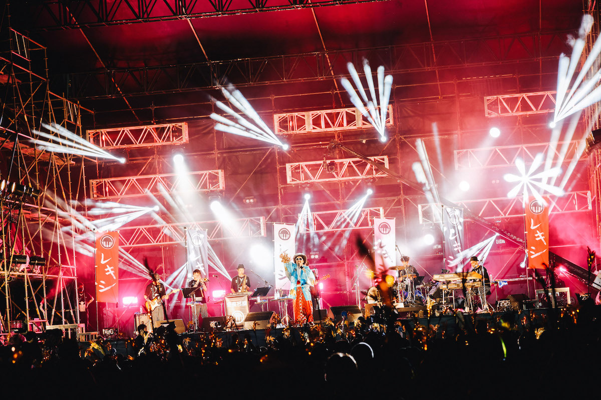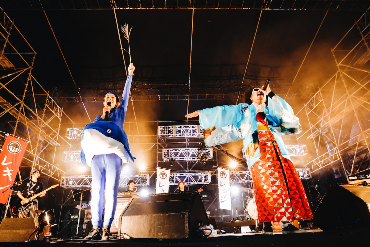 『SWEET LOVE SHOWER 2022』の3日間はレキシによって締め括られた。この日だけで1000本売れたというグッズの光る稲穂が揺れる中、大名行列の籠の中から池田貴史が登場。のっけからレキシのライブでしかまずあり得ない光景が生まれているのが痛快だ。そして「SHIKIBU」から演奏がスタート。凄腕のバンドメンバーがグルーヴィーなサウンドを会場に轟かせる中、スキャット混じりに一句詠む姿が最高にファンキーだ。さらに多くの人が期待していた通り、「KMTR645」も披露され、直前に同じステージに出演したキュウソネコカミのヤマサキ セイヤと共演、キュウソのメンバー全員がステージに駆けつけた。