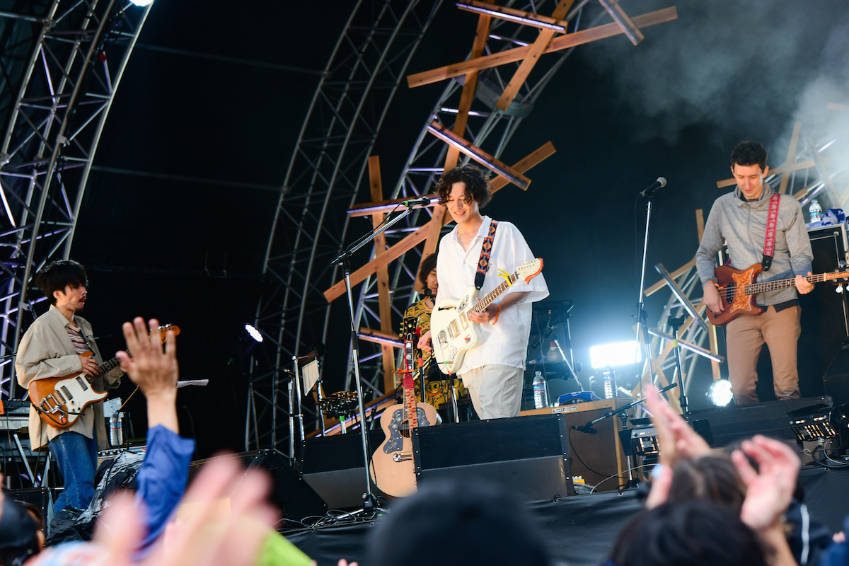 そうして演奏されたのは「夏を生きる」だ。2020年夏、この季節ならではのきらめきに想いを馳せてリリースされたこの曲が、3年ぶりに開催された夏フェスで鳴らされる意味は大きい。晩夏を感じさせる出だしから太陽の光を反射させるようなサビまで、バンドが鮮やかなグラデーションを描く中、長屋は力強くロングトーン。その響きが心に深く残った。その後はビートに乗せて穴見がスラップを、小林がワウギターを嚙ませてから始まる長屋&小林のツインボーカル曲「S.T.U.D」などを披露し、「キャラクター」で終了。熱量を込めて締めの音を何度か鳴らすと、「ラブだよー!」と最後まで愛を届けた。