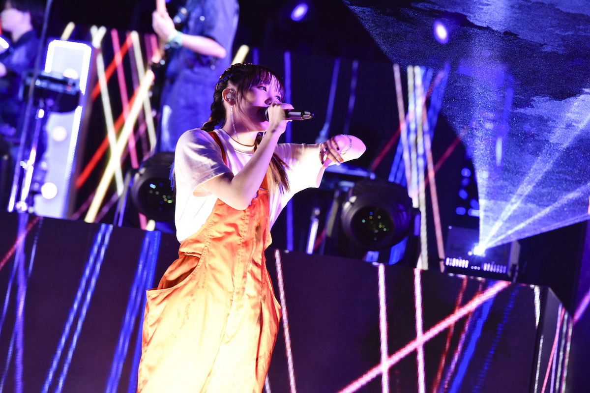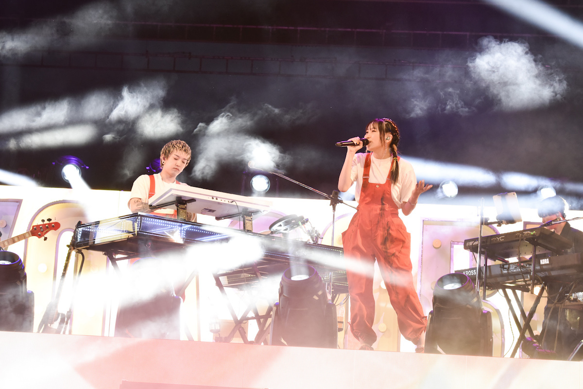 最初からトップギア、「大正浪漫」までの4曲を一気に届けたYOASOBI。まだライブ経験が少ないため観客に投げかける言葉は初々しいが、クラップなどを促しながら、一緒にこのライブを作ろうと丁寧に伝える姿が印象に残った。観客がスマホライトを灯す中で歌を届け、この夏の特別な思い出に成り得るシーンを生み出したのは「アンコール」。マイナーキーの曲だけに、他とは少し違うボーカルの表情が垣間見えたのは「怪物」。ステージから発せられる音楽が会場奥まで伸びていく様が、ツバメの羽ばたくアニメーションとよくマッチしていたのは「ツバメ」。そしてラストは「群青」。今日が終われば日常に戻るリスナー一人ひとりの心の支えとなるメッセージを最後に握らせた。
