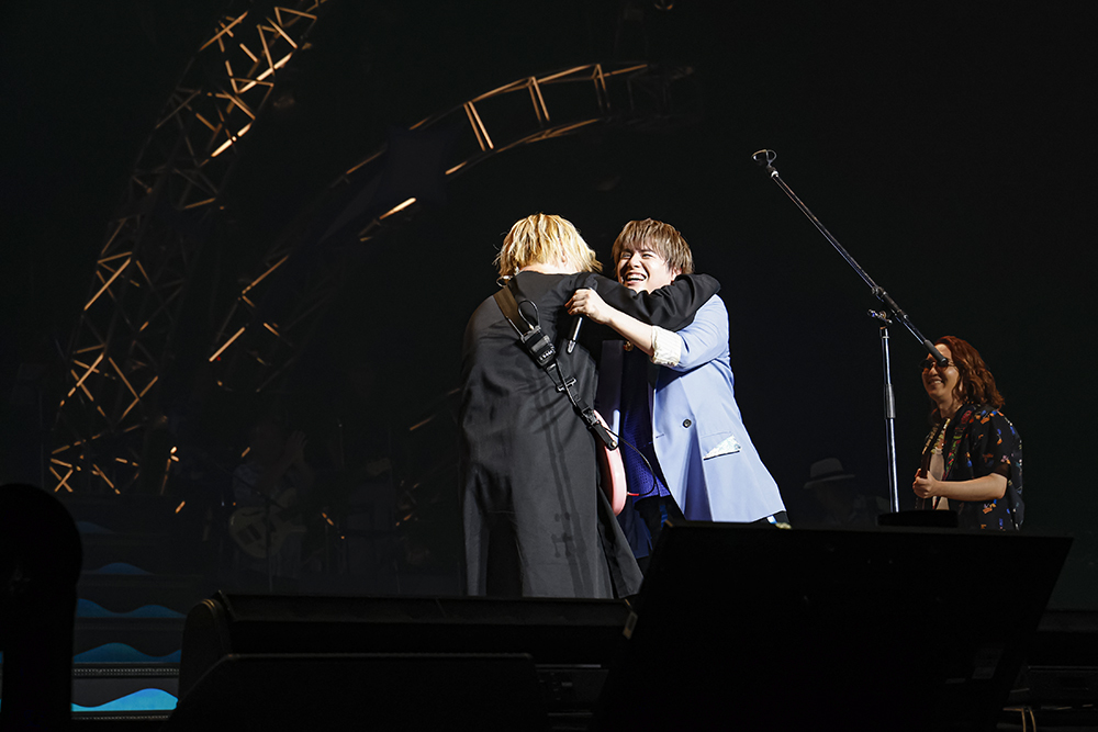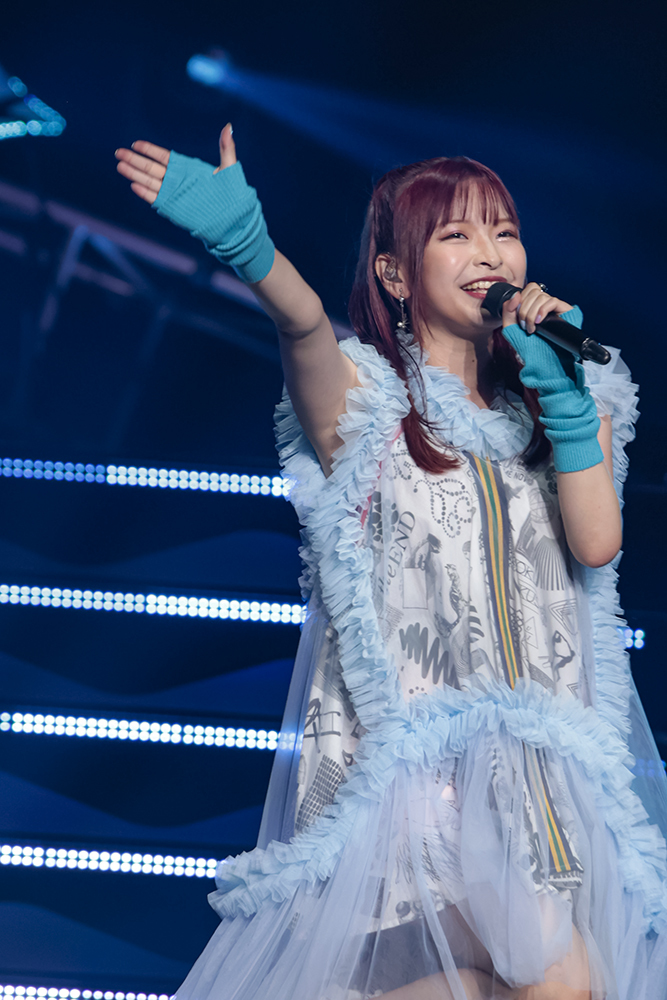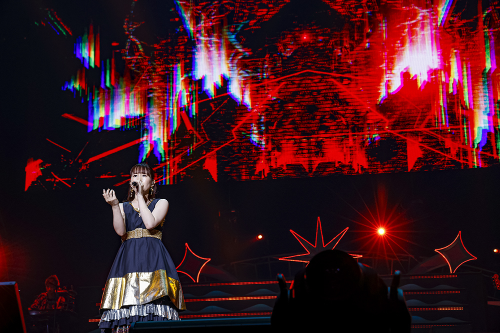 歌い終えてのMCでは、観客数制限のあった前回とはまったく違う満員の会場の光景に感動。アリーナとスタンドに分かれてのコンサートライトでのアピールをしてもらうなどして、いつものアニサマの風景が戻ってきたことへの嬉しさを語った。