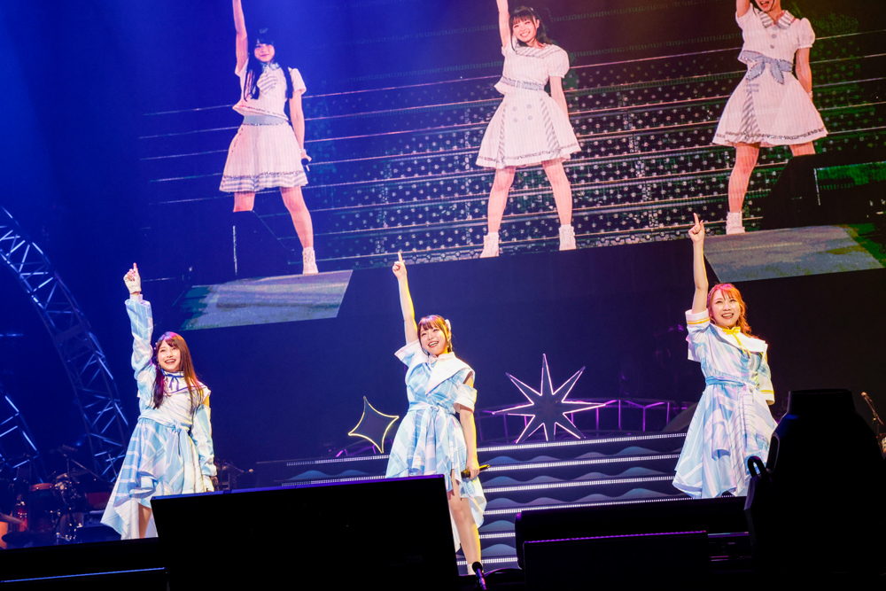 そう宣言して再開したライブ2曲目は、前曲から一転してかわいい雰囲気の新曲で、TVアニメ『阿波連さんははかれない』OPテーマ「はなれない距離」。軽やかなハーモニーと三人で寄り添いながらのダンスで魅せるなど、柔らかな可愛らしいステージをPVを交えながら繰り広げた。