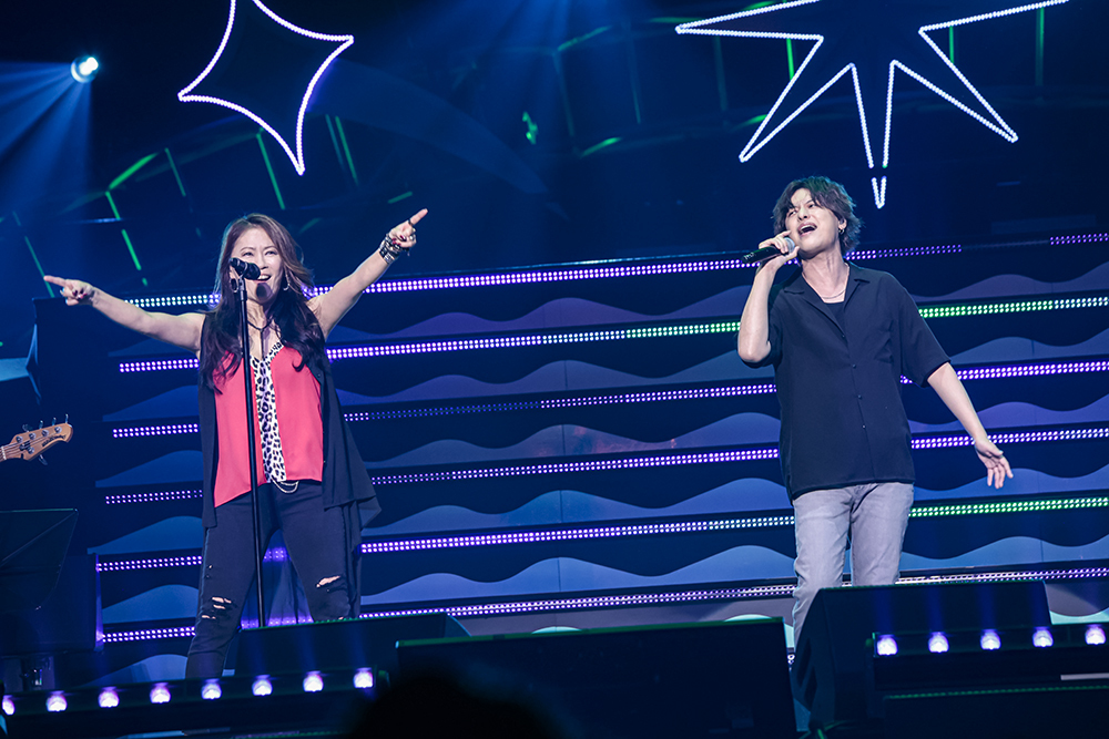 そして三曲目にはコーラスとして大黒摩季もステージに登場。二大ベテラン同士のコラボで贈るのは、こちらもアニソン界の歴史的名曲であるTVアニメ『SLAM DUNK』第2期EDテーマ「世界が終るまでは…」。じっくりと聞かせる名曲がボーカリスト二人の手に掛かることで静かな迫力と味わいに満ちた仕上がりに。特にサビの迫力は絶品でアニサマでしか聴けない実力派の共演に大きな拍手が送られた。