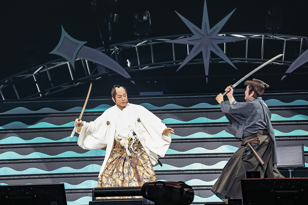 怒った芹澤優が浪人達に食ってかかるも切り捨てられてしまいi☆Risとまあや姫は大ピンチに。だが、こんなピンチを救ってくれるヒーローを召喚しようとするi☆Risの叫びに応えて現れたのは……何と暴れん坊な将軍めいた姿の松平健! 客席からも思わず声も漏れてしまうような大きなどよめきの中、松平健が見事な殺陣で浪人達を蹴散らしてi☆Risとまあや姫のピンチを救うと大きな拍手がスーパーアリーナを埋めつくした。