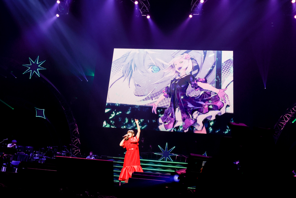 アリーナ中央のステージに登場したのは、同作内の舞台・Tokyo-7thのトップアーティストである双子ユニットのKARAKURI(CV:秋奈)。ステージ上では一人だが、スクリーンにはミラーリングで二人になって映し出されるという演出と共に、ピアノソロから激しいデジタルアッパーチューンへと突入し、ラップを交えながらクールさと激しさが同時進行で交錯する刺激的なナンバーを熱唱。場内をTokyo-7thの世界へと見事に塗り替えて見せた。