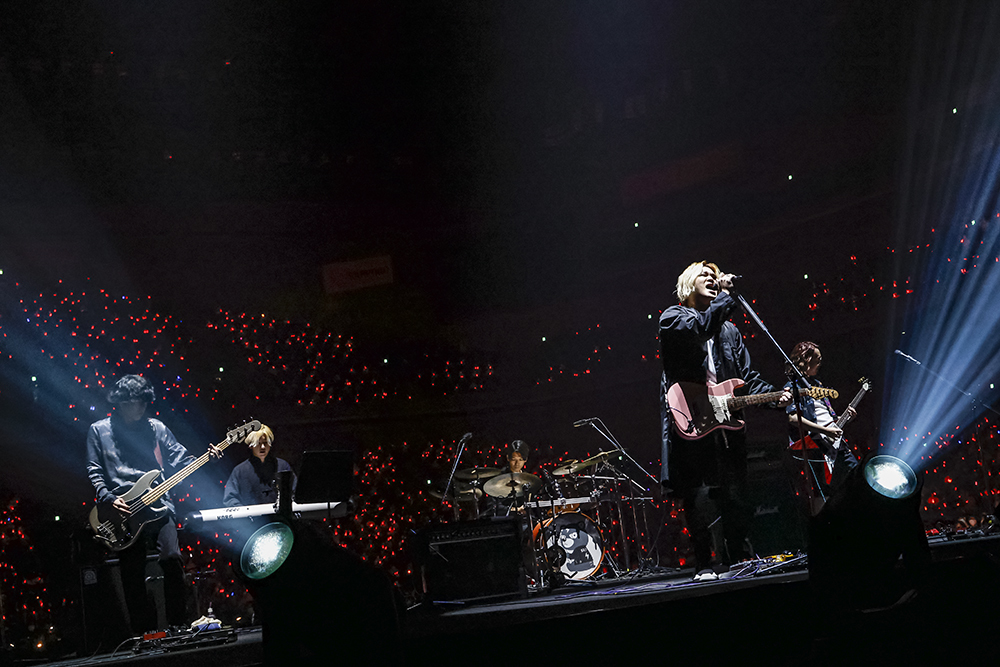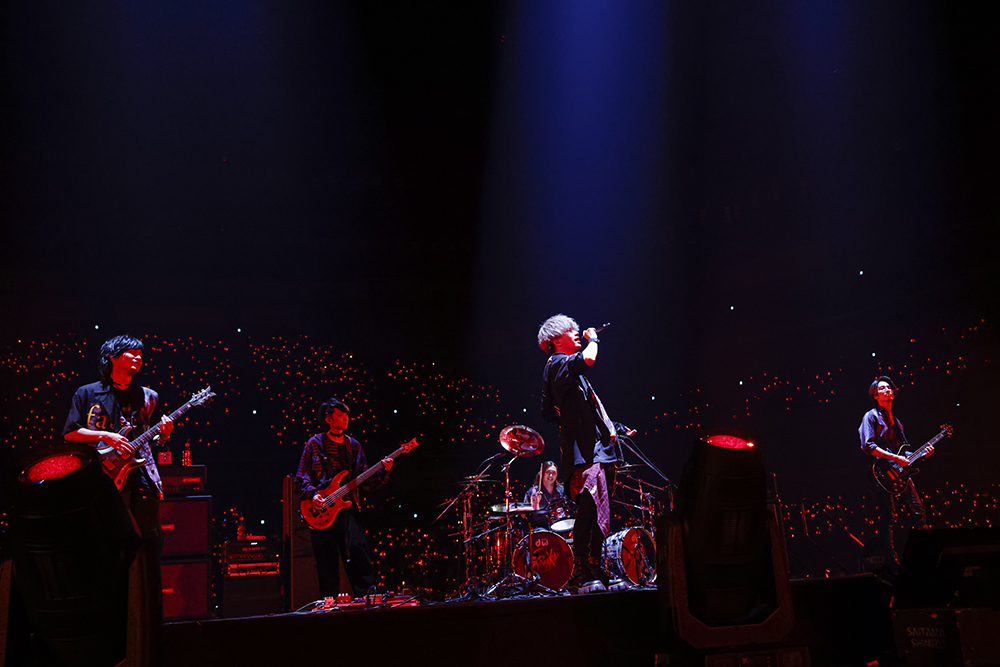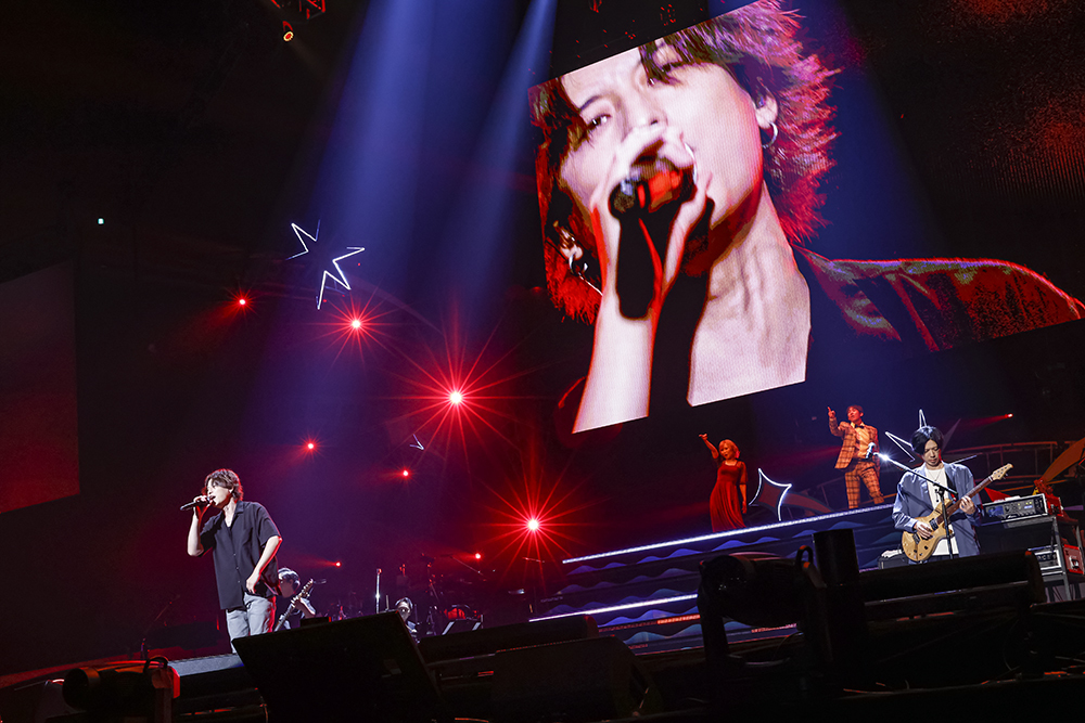 暗闇に包まれた会場内をパトライトの赤い光が飛び交いサイレンが鳴り響く。そんな中で響き渡るのは、今回のために新録されたという江戸川コナン(CV:高山みなみ)のナレーション。それを合図に舞台下からポップアップでWANDSのボーカル・上原大史がステージに出現。唄うのは2020年にTVアニメ『名探偵コナン』のOPテーマとなった「真っ赤なLip」だ。男と女の駆け引きをミステリーになぞらえたナンバーを圧巻のボーカルと迫力の演奏で唄い上げて、場内のファンを一気に自分達の世界へと引き込んでいった。